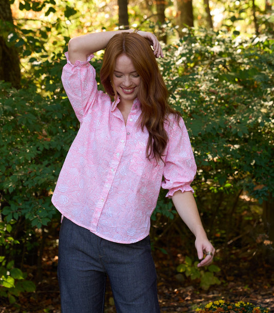 Good Girlfriend Shirt with Ruffle Trim Floral Escape Tickled Pink/Rose