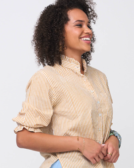 Good Girlfriend Shirt with Ruffle Trim Menswear Stripe Honeycomb