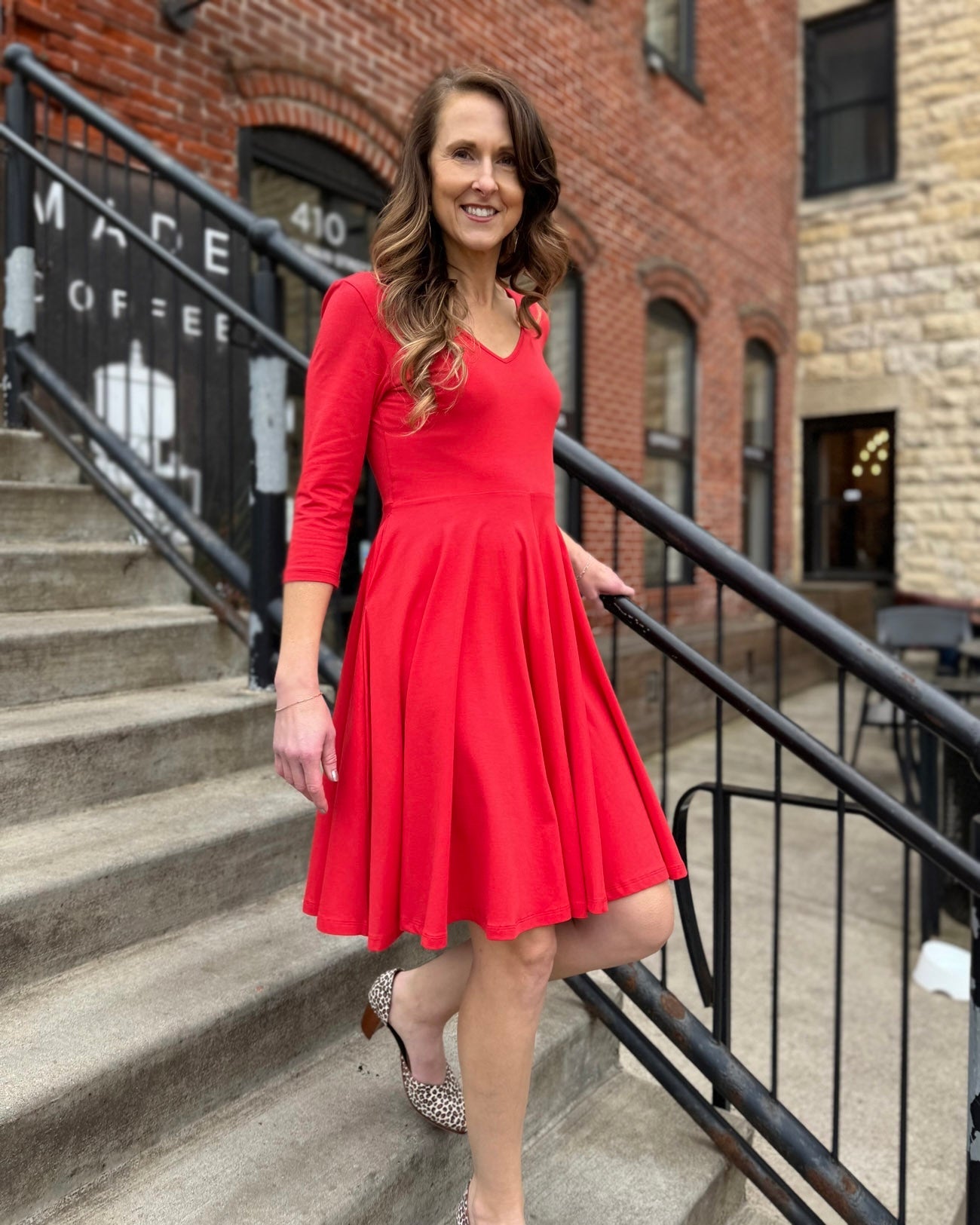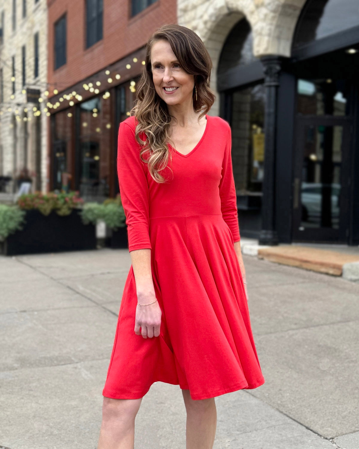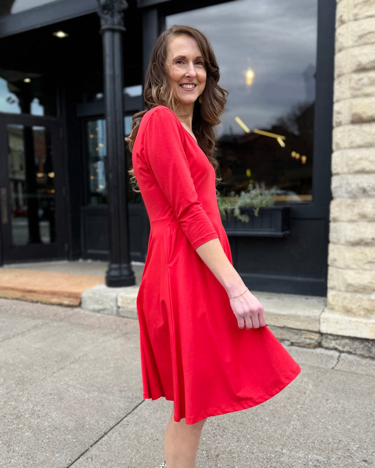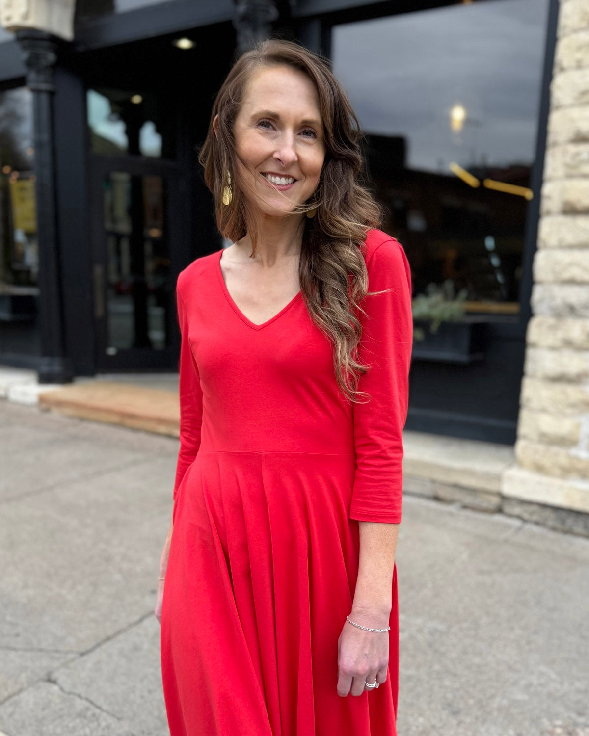 This twirly 4-panel dress is an elegant choice for any occasion. Enjoy hidden pockets in the side seams. Layer this season with these fitted 3/4 length sleeves under cardigans and sweaters.