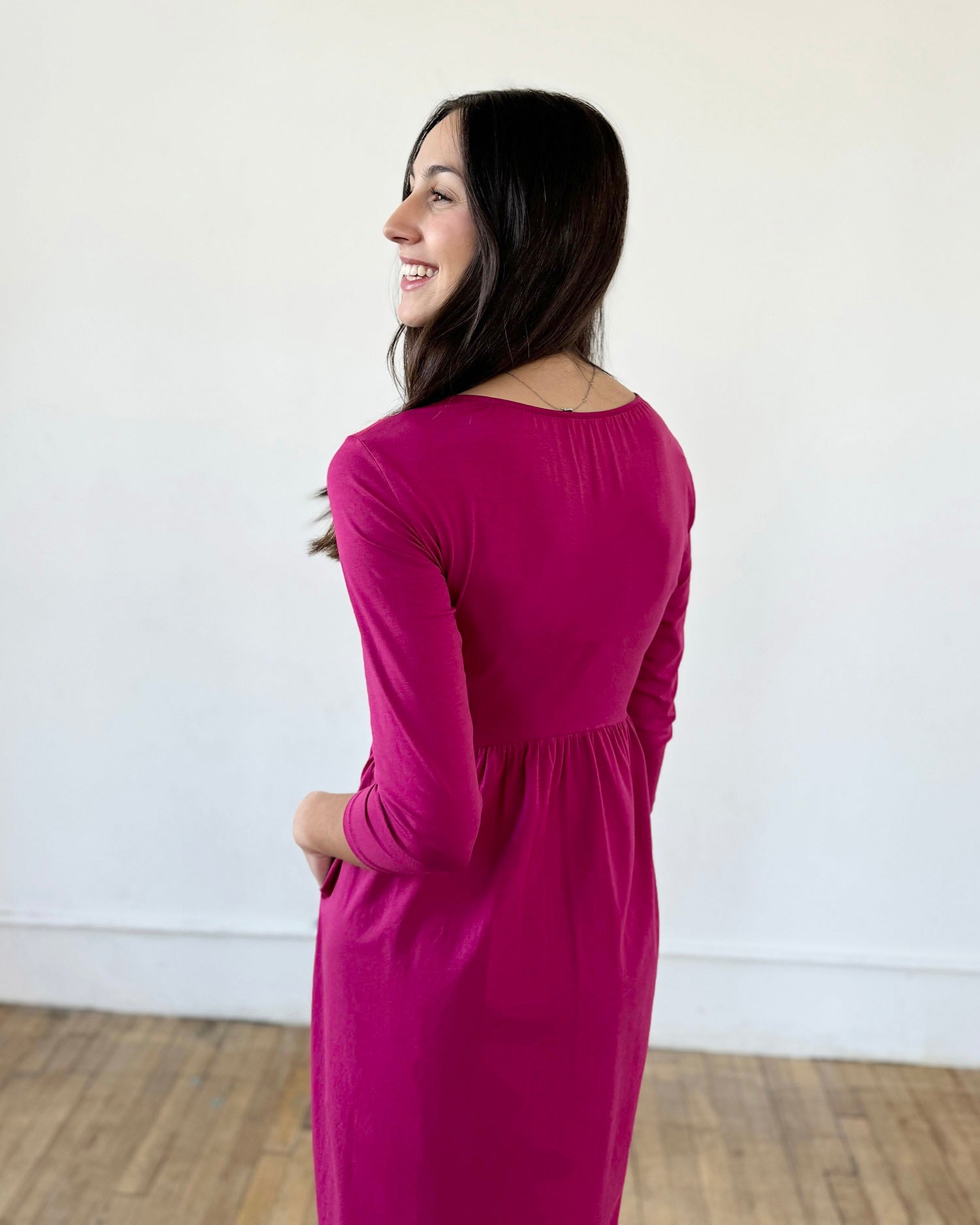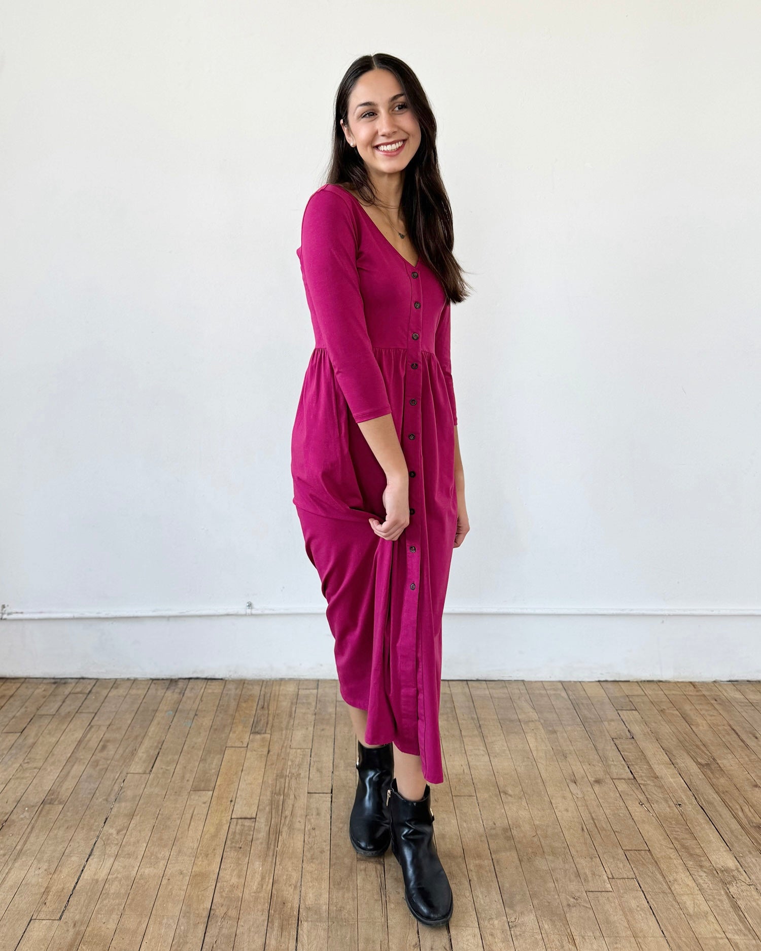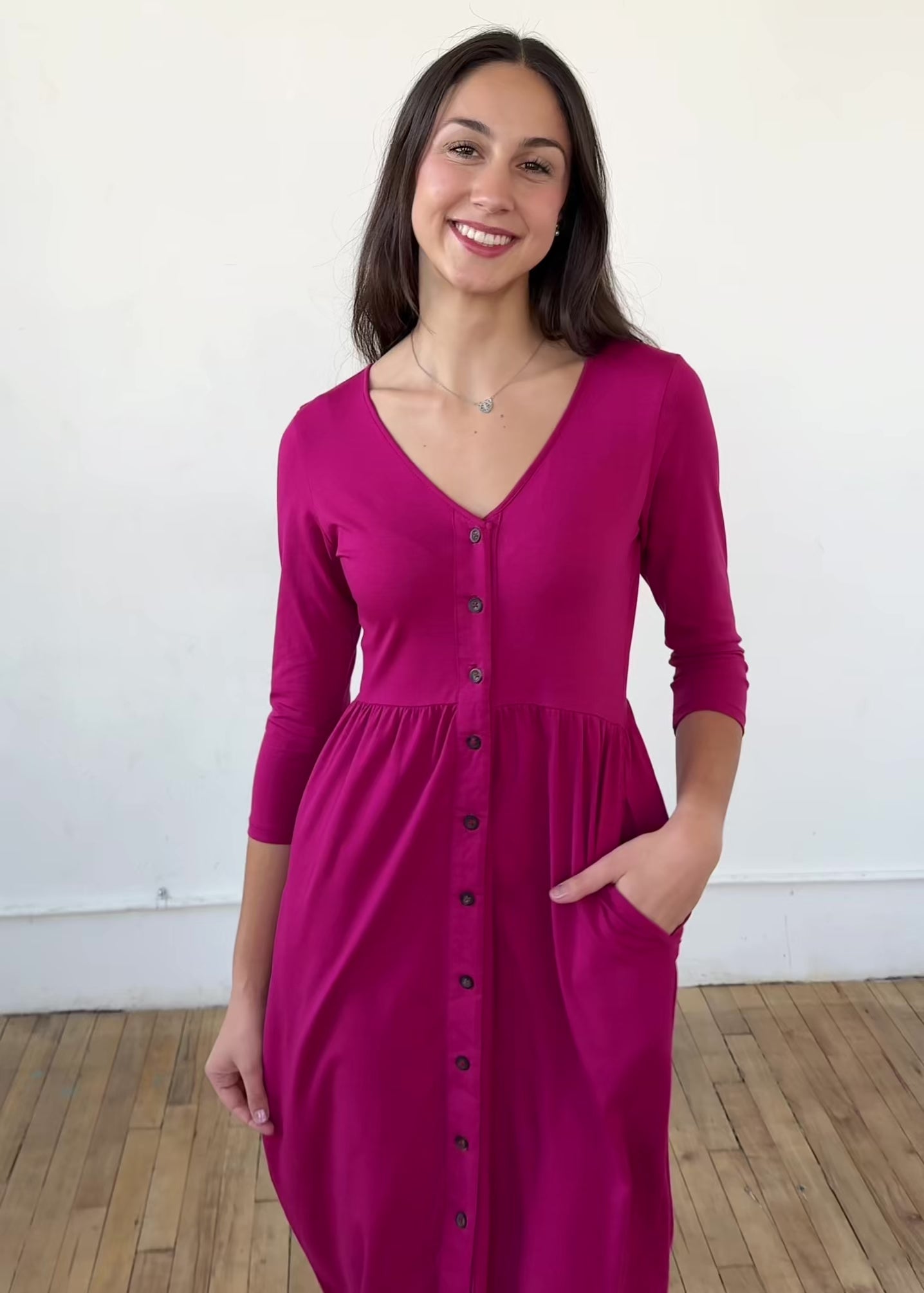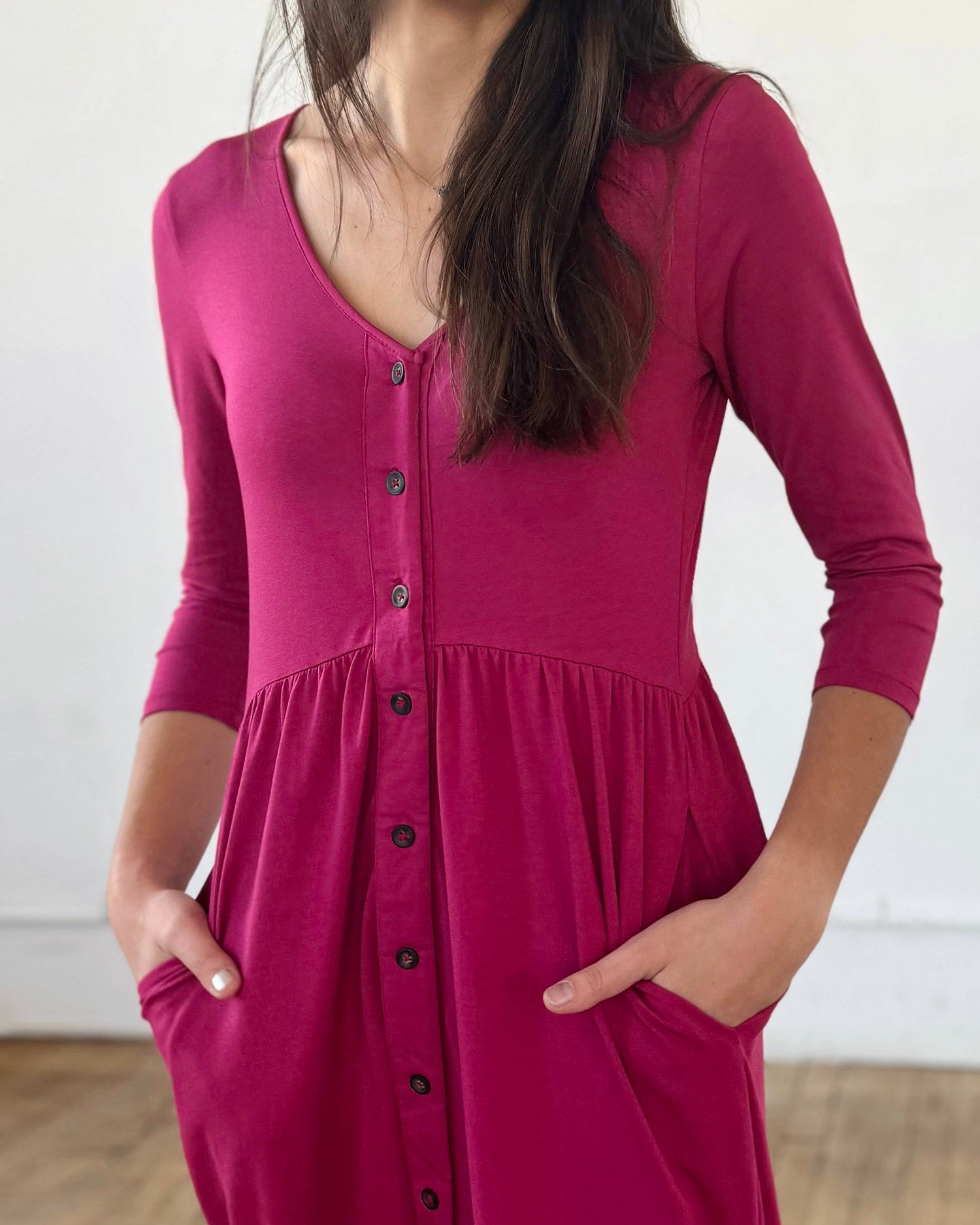 This effortless dress makes an elongating statement with the center button placket and slit. Hidden pockets are in the side seams, and the fitted 3/4 length sleeves can layer under cardigans. Nursing mamas will enjoy that the first few buttons are functional.