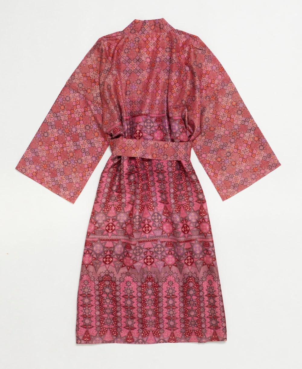 Upgrade your loungewear with this breezy silk robe made from repurposed vintage saris. Designed with boxy 3/4 length drop shoulder sleeves and an adjustable tie belt closure for a custom fit, this silk robe hits just below the knee for a luxurious aesthetic. Perfect for everyday lounging or getting ready for a night out, the silky fabric glides against your skin to keep you cool. There's even a loop sewn into the collar to easily hang it up after wearing.