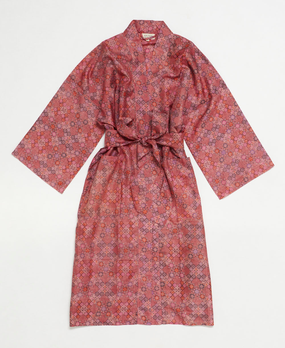 • Size: Medium • Materials: Silk blend from vintage saris • Featuring: 2 front patch pockets, locker loop at neck & removable tie belt • Each silk robe is one-of-a-kind • Sheerness may vary based on vintage fabric • Handcrafted by a skilled woman artisan in Ajmer, India Dry clean recommended or hand wash in cold water with mild detergent and hang to dry out of direct sunlight. Warm iron, if desired. All orders will ship within 1-3 business days from their studio in Louisville, KY. Express orders are expedited and shipped within 1 business day. Economy orders, shipped via UPS Ground or USPS Ground Advantage, typically arrive in 1-5 business days based on destination. Express orders are sent via UPS Next Day Air and arrive within 1-2 business days. Domestic economy shipping is free on orders over $225. Anchal accepts exchanges and returns within 14 days of the delivery date. Exchanges and returns for store credit are free. Returns for refund are subject to a $10 flat rate return shipping fee if approved.