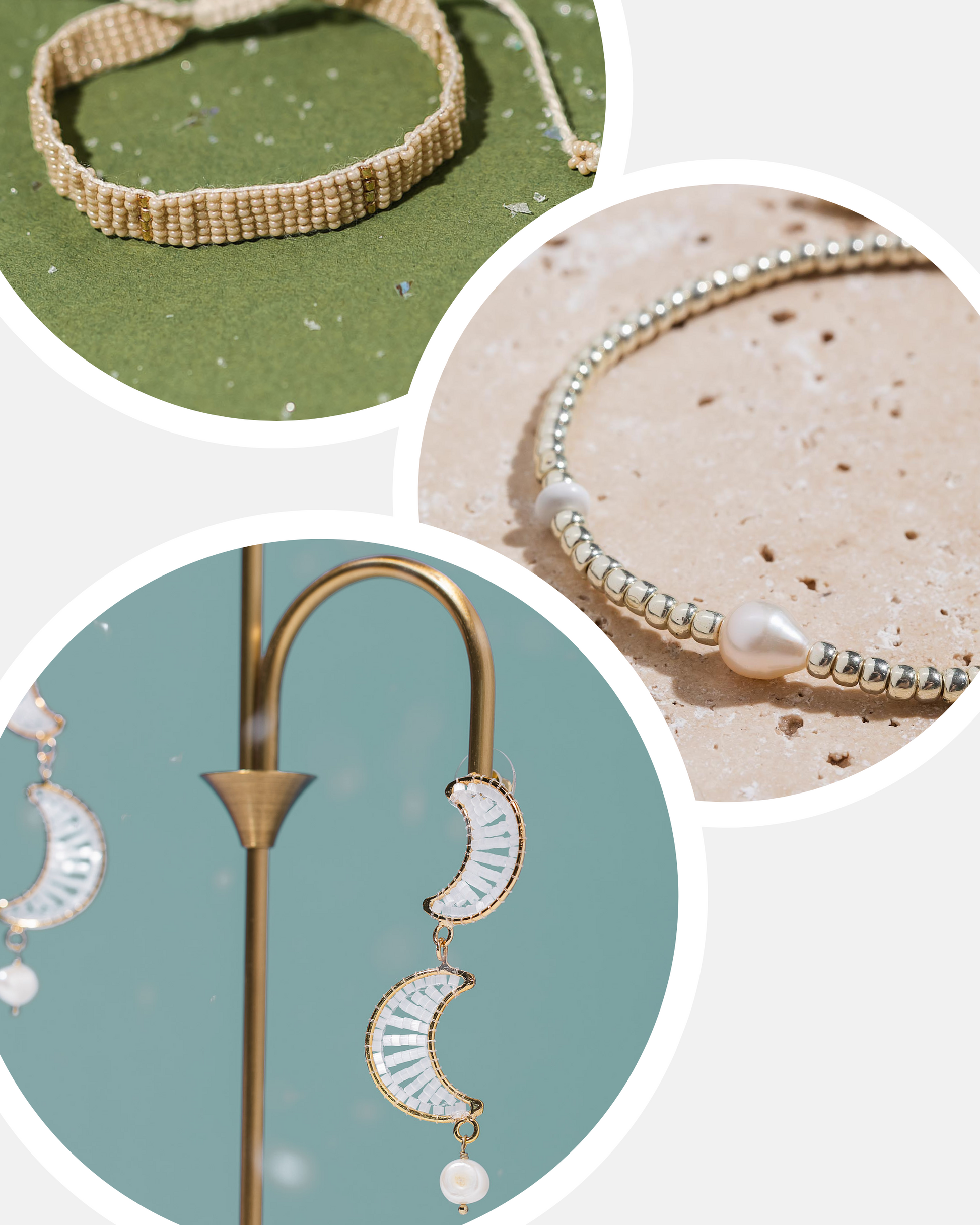 Approx. Measurements: Cambodian Dawn Bracelet: Adjustable 6 1/2-9". Indian Dawn Bracelet: 6 1/2-9". Moon Earrings: 2 3/4" Materials: Cambodian Dawn Bracelet: Seed beads, Freshwater Pearl, Howlite, Cording. Indian Dawn Bracelet: Seed beads, Cotton cording. Moon Earrings: Seed beads, Plated brass. Color: Cambodian Dawn Bracelet: Champagne, White. Indian Dawn Bracelet: Champagne, Gold, Cream. Moon Earrings: Natural, White, Gold