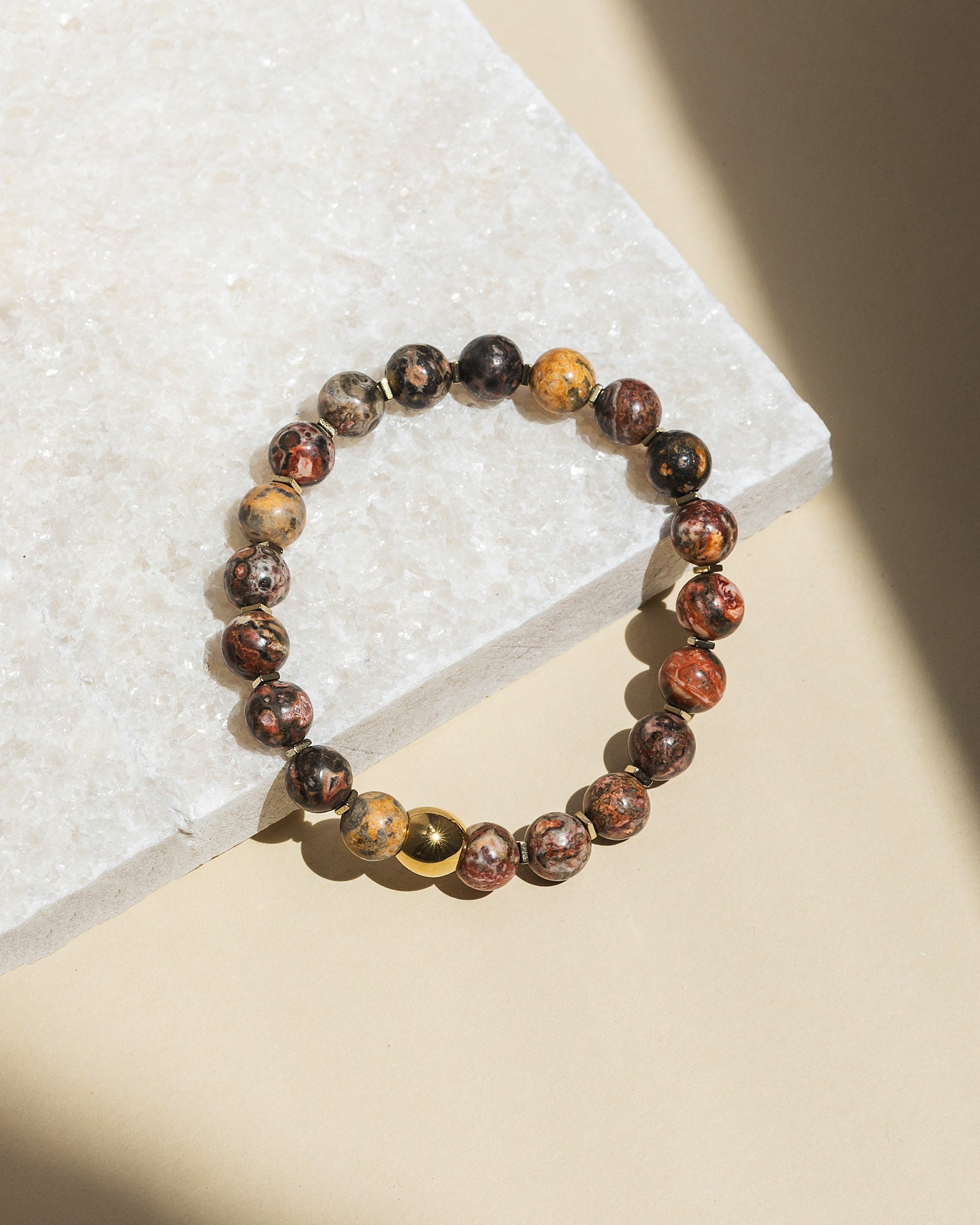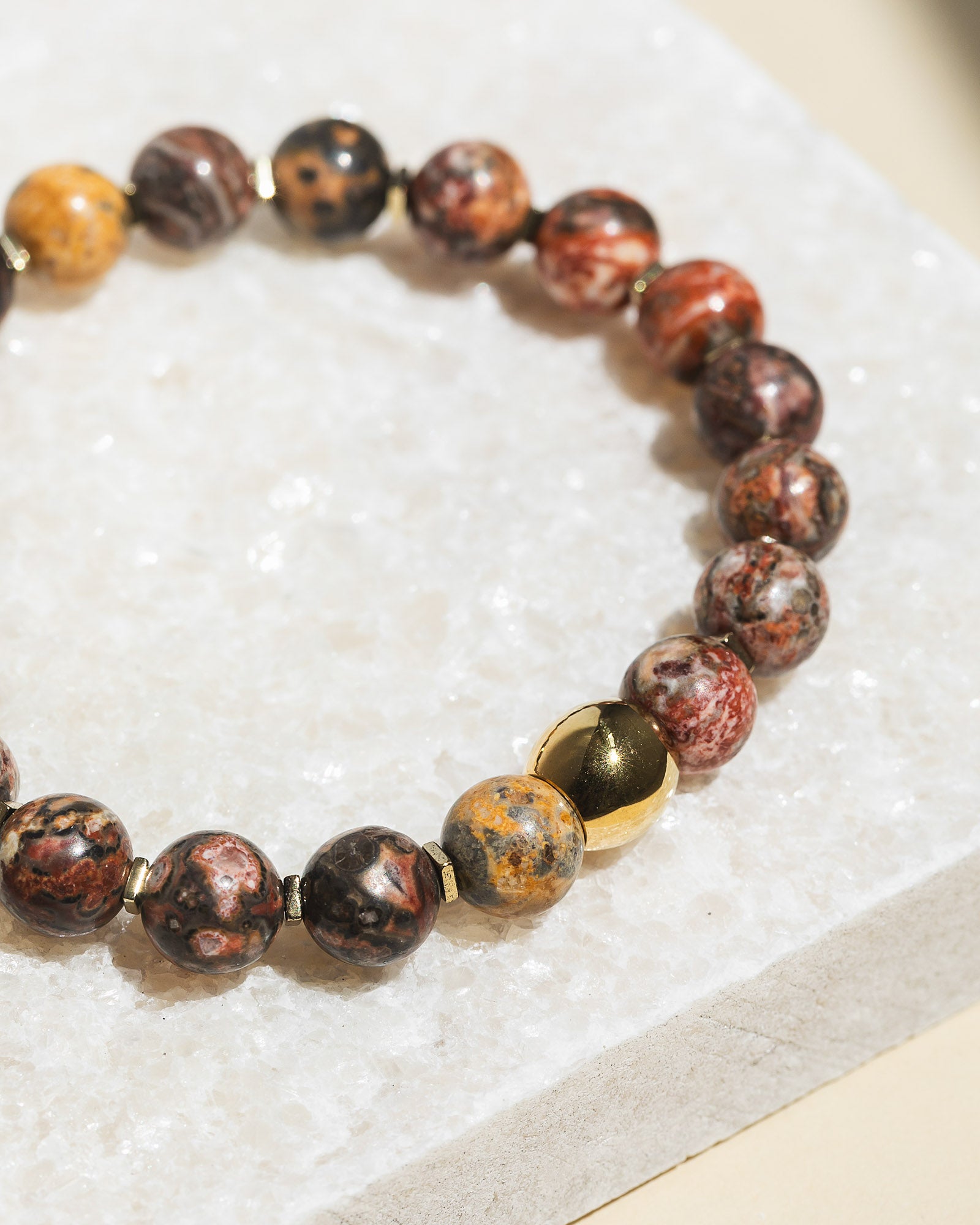 Measurements: Cygnus Mini Pouch: 6 1/4" W x 4 3/4" H; Elva Rose Bracelet: Stretch 6 3/4" Materials: Cygnus Mini Pouch: Poly silk, Neelam thread, Antique brass; Elva Rose Bracelet: Jasper Stone beads, 18K Gold-plated stainless steel Color: Cygnus Mini Pouch: Black, White, Gold; Elva Rose Bracelet: Rust, Brown, Burgundy, Orange, Gold