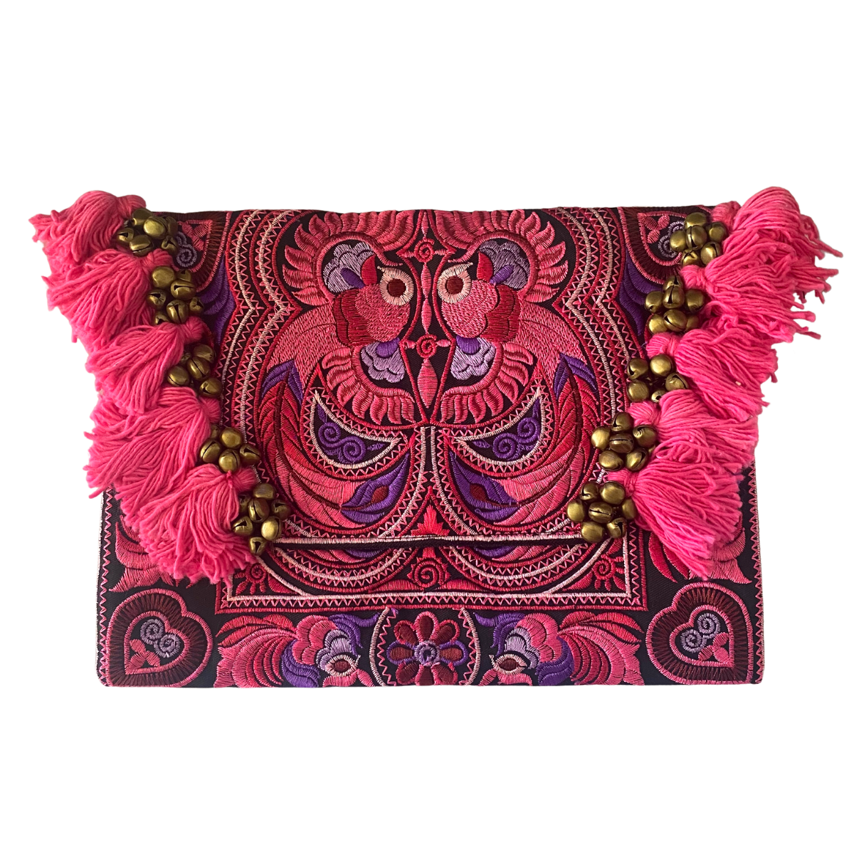 Discover our boho-inspired clutch bag, meticulously crafted by Ae in the highlands of Thailand. This eye-catching piece showcases a charming embroidered bird pattern, complemented by a soft cotton lining and adorned with delightful fringe pom poms and brass bells.