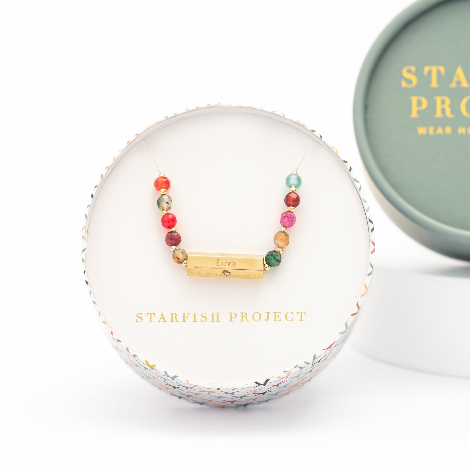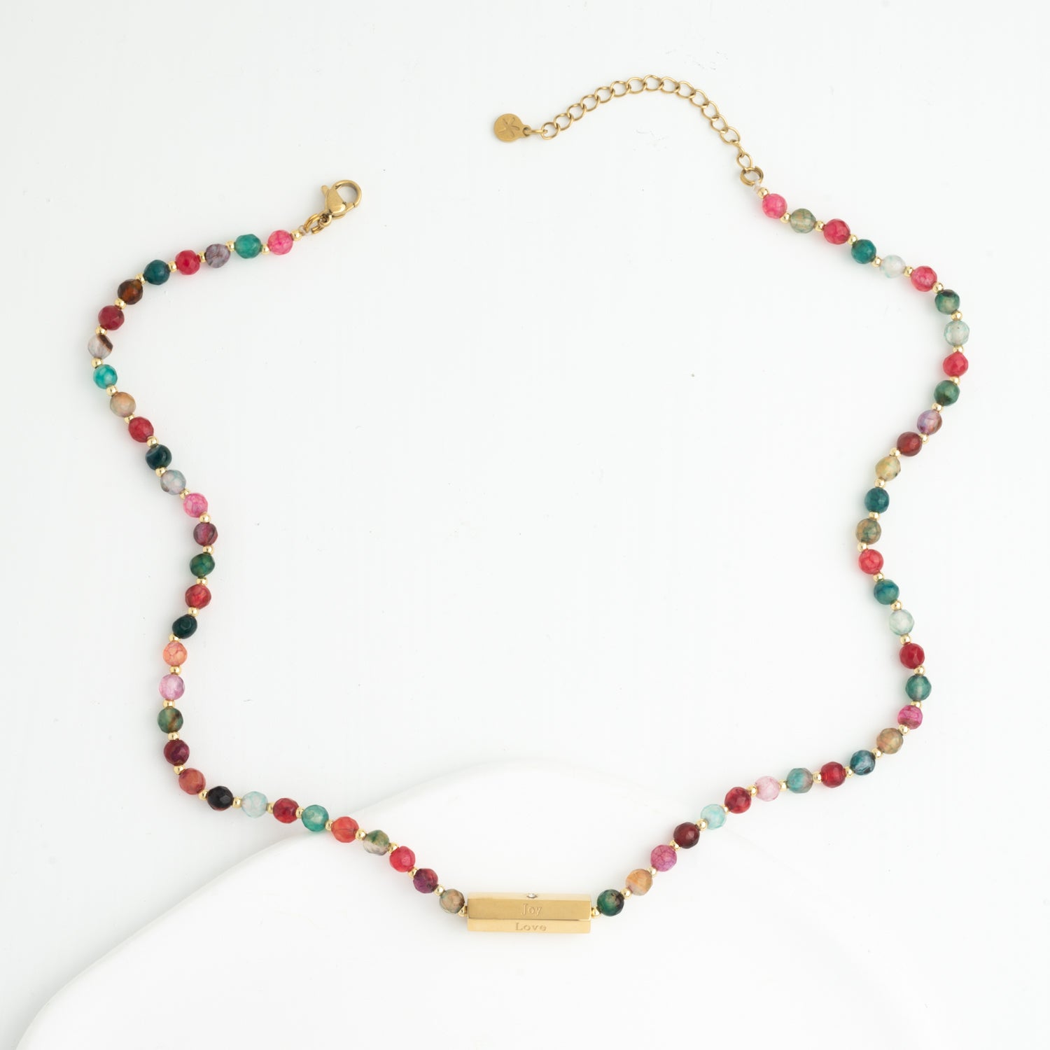This vibrant agate beaded necklace, featuring hues of red and green, is a beautiful symbol of the Advent season. The engraved words "hope," "peace," "love," and "joy" on the adjustable 14k gold-plated bar pendant serve as a daily reminder of the spirit of this special time of year. Its versatile design makes it easy to layer, yet it makes an impactful statement when styled on its own. Wear and gift this hand-beaded, survivor-created necklace as a reminder of the joy and anticipation of hope.