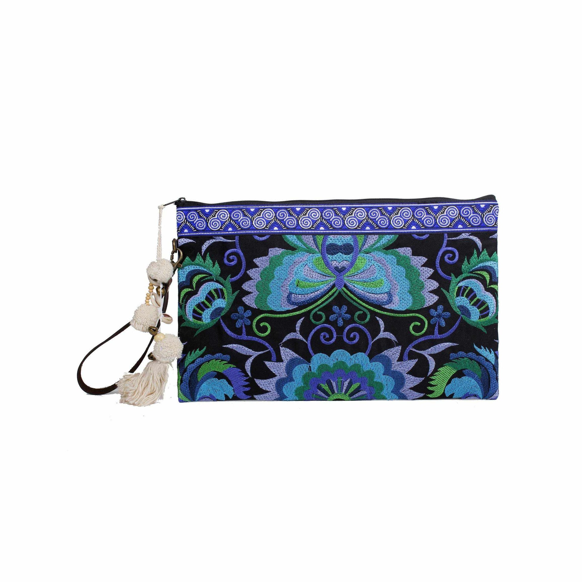 Don't miss out on one of our best selling items! The Botanica wristlet is part of our Thai embroidery collection that handcrafted with care by our artisan partners using Hill-Tribe fabrics. The bag is finished with handcrafted pompom zipper pull and a removable leather strap.