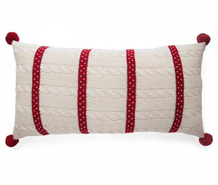 Enhance your holiday décor with this elegant knit holiday throw pillow. Featuring a classic cream cable-knit design, this pillow is beautifully accented with rich red stripes, adding a festive touch to your home. The playful pom-poms at each corner bring an extra layer of charm, making it a delightful addition to any holiday setting.