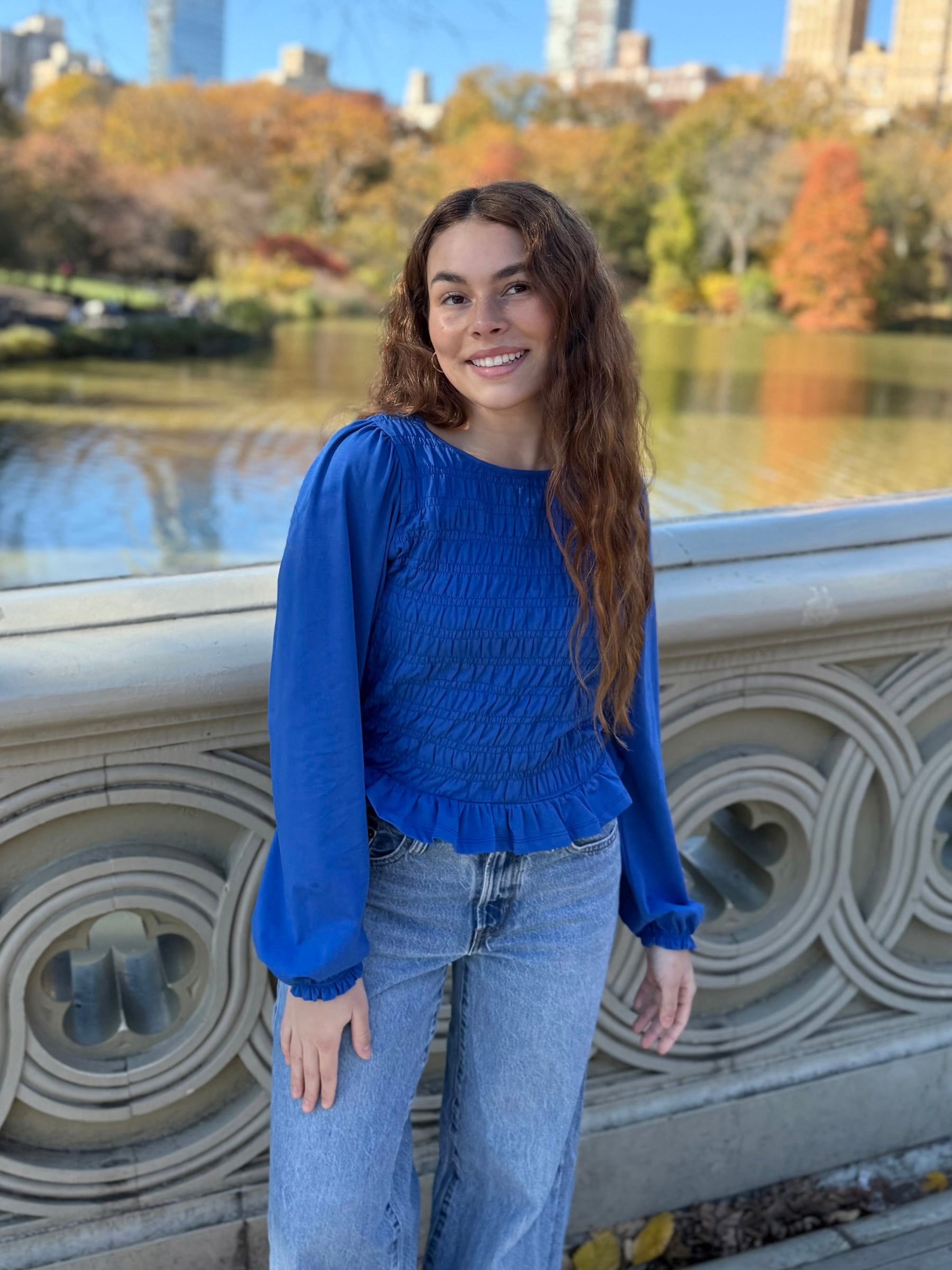 The Caecilia top has a feminine ruffled hem and beautiful smocking. The texture of the stretchy smocking makes for an effortless body-contouring fit, creating a defined silhouette that flatters your shape.