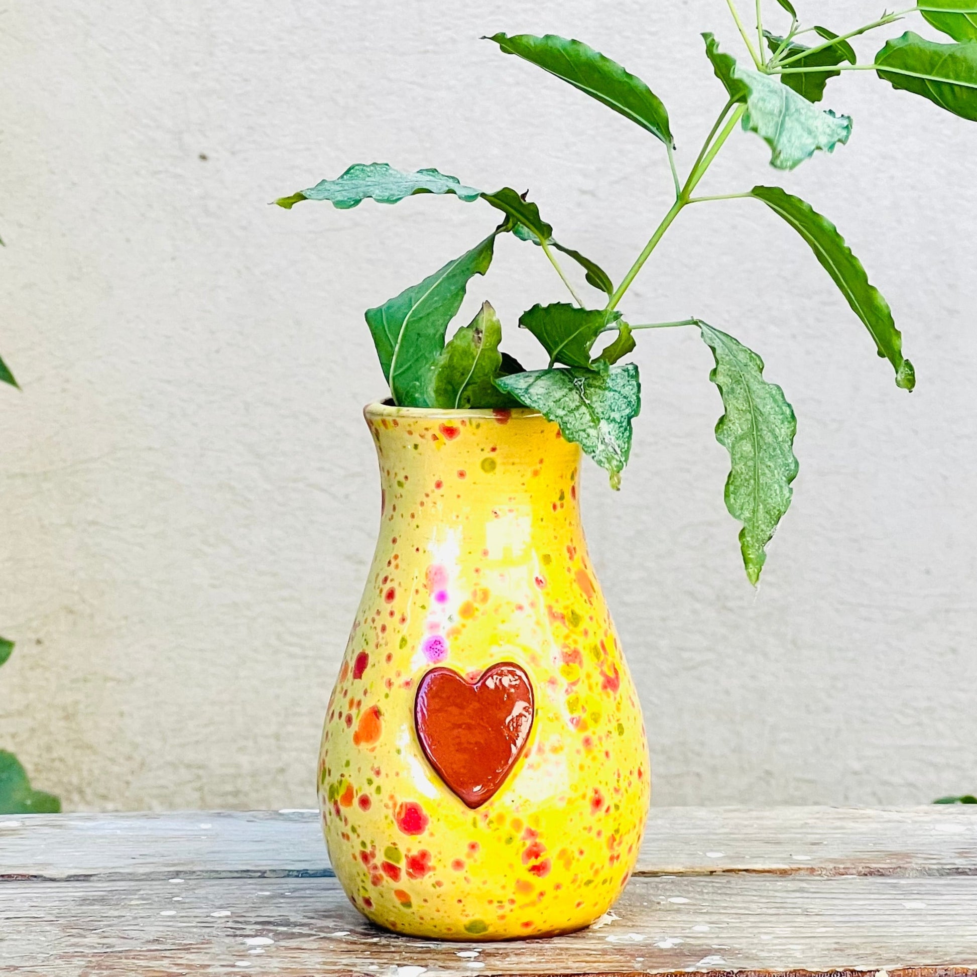 Cute little vase in bright speckled red with a button heart on the front! A house favorite!!