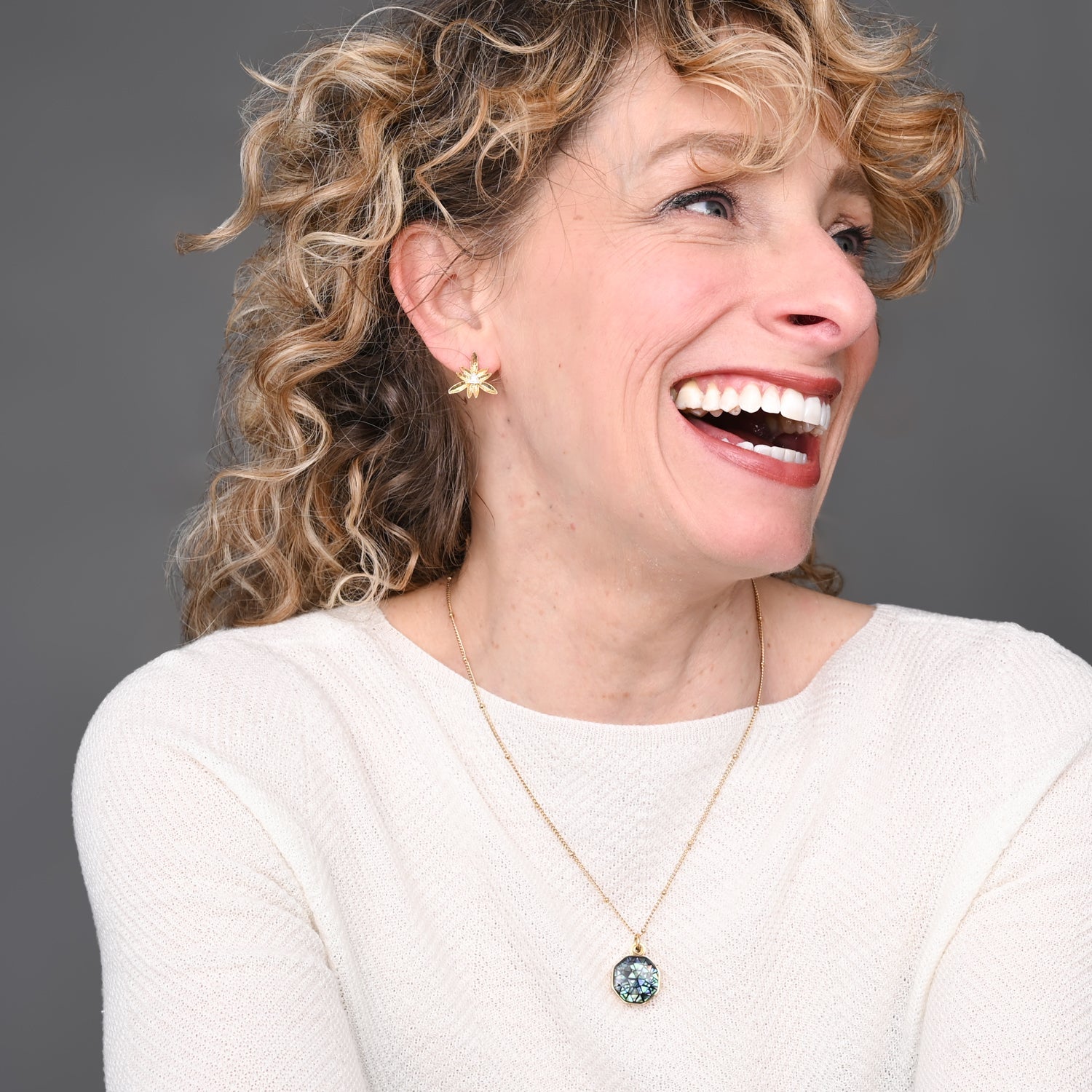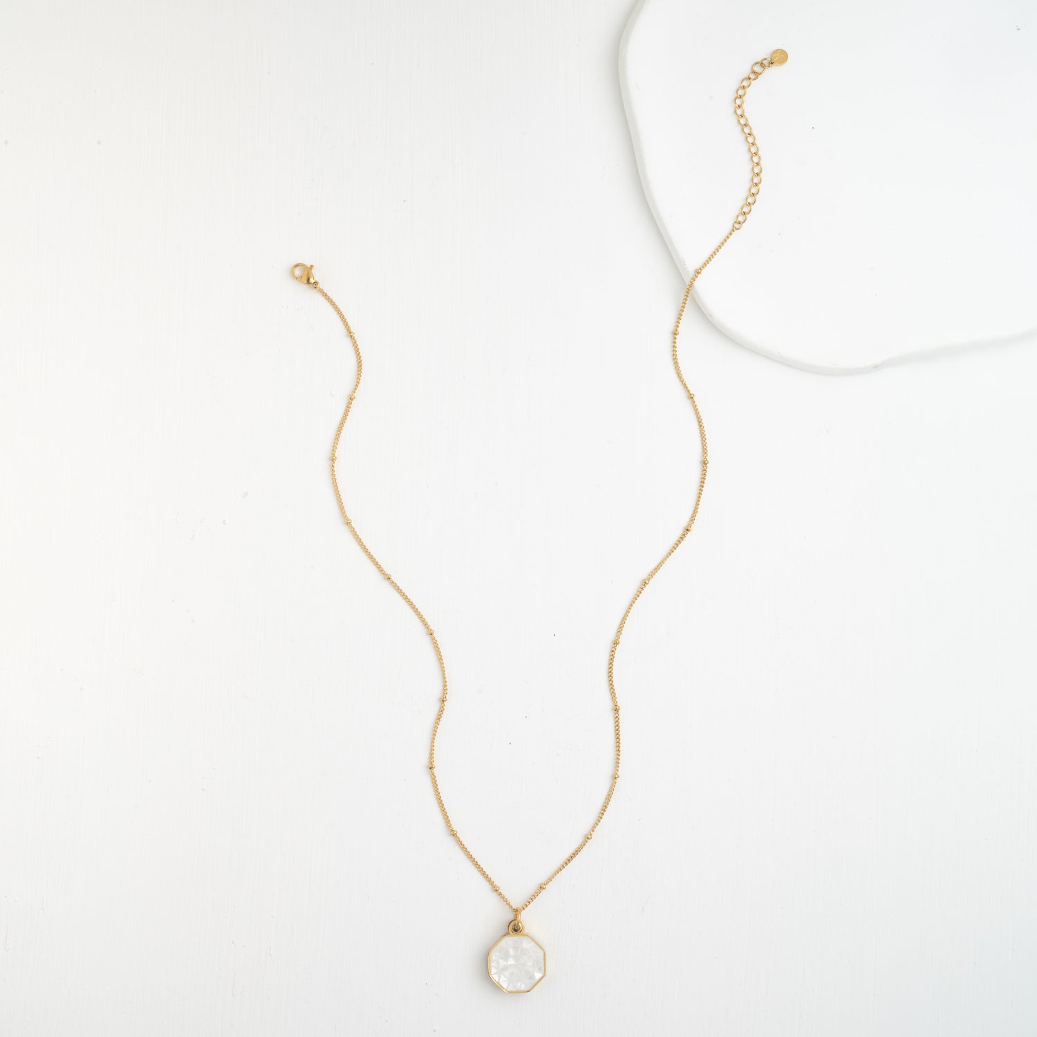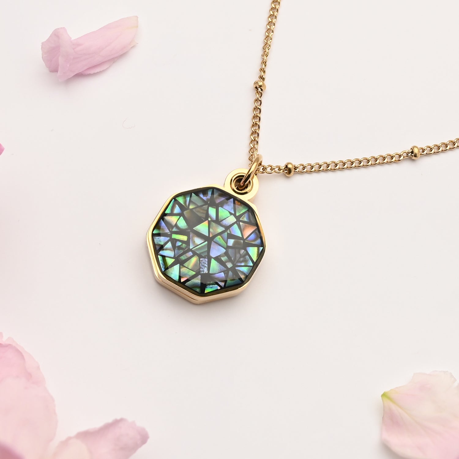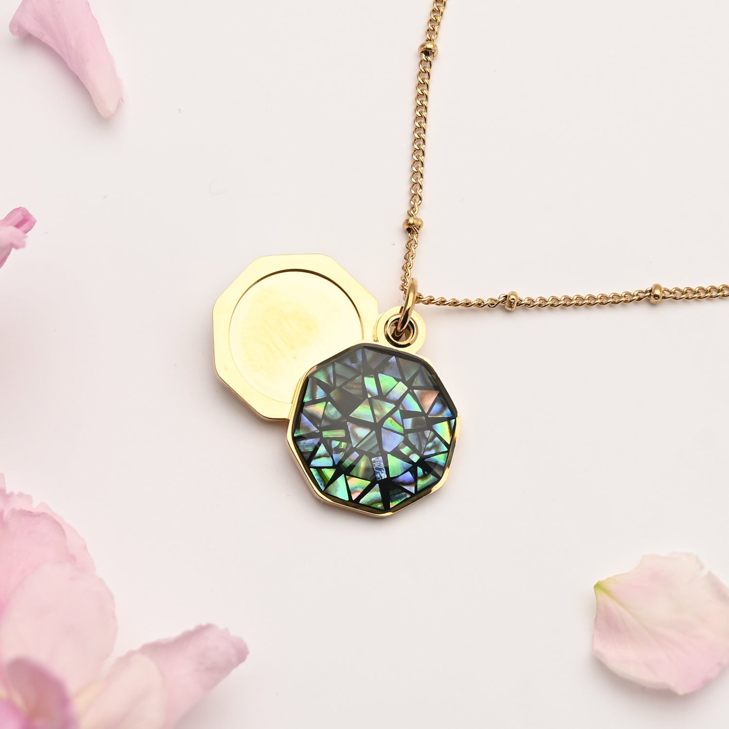 Two sides, one story—of resilience, beauty, and love. The Cherished Reflections Locket is a stunning reversible adjustable locket necklace featuring iridescent mother-of-pearl on one side and captivating abalone shell on the other, all encased in 14K plated gold. The unique octagonal shape adds a modern touch to this timeless treasure. Wear it with the shimmering mother-of-pearl facing outward for a soft, radiant glow, or flip to the abalone shell for a bold and vibrant look. Perfect for layering or wearing solo as a cherished statement piece with a photo of your loved one within.