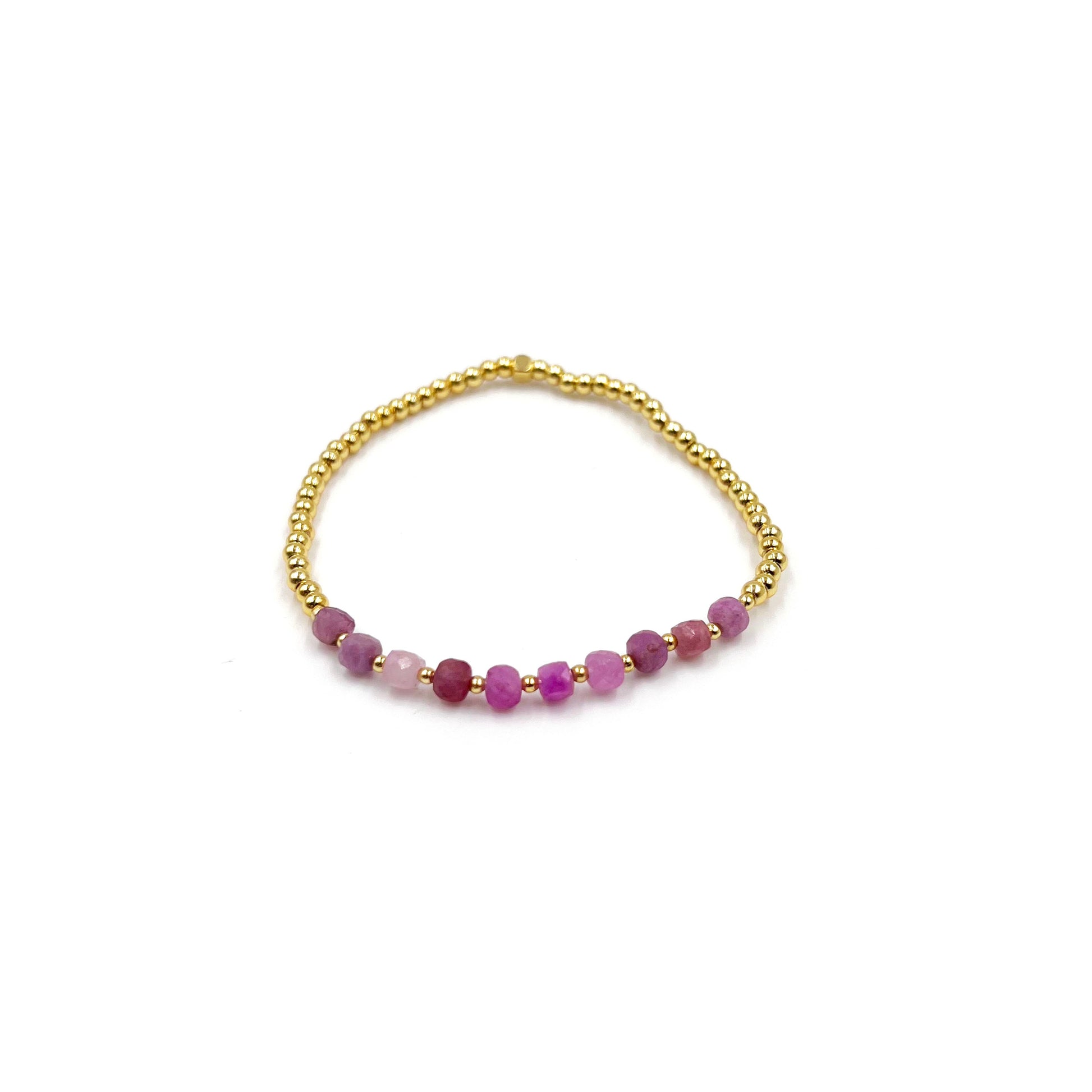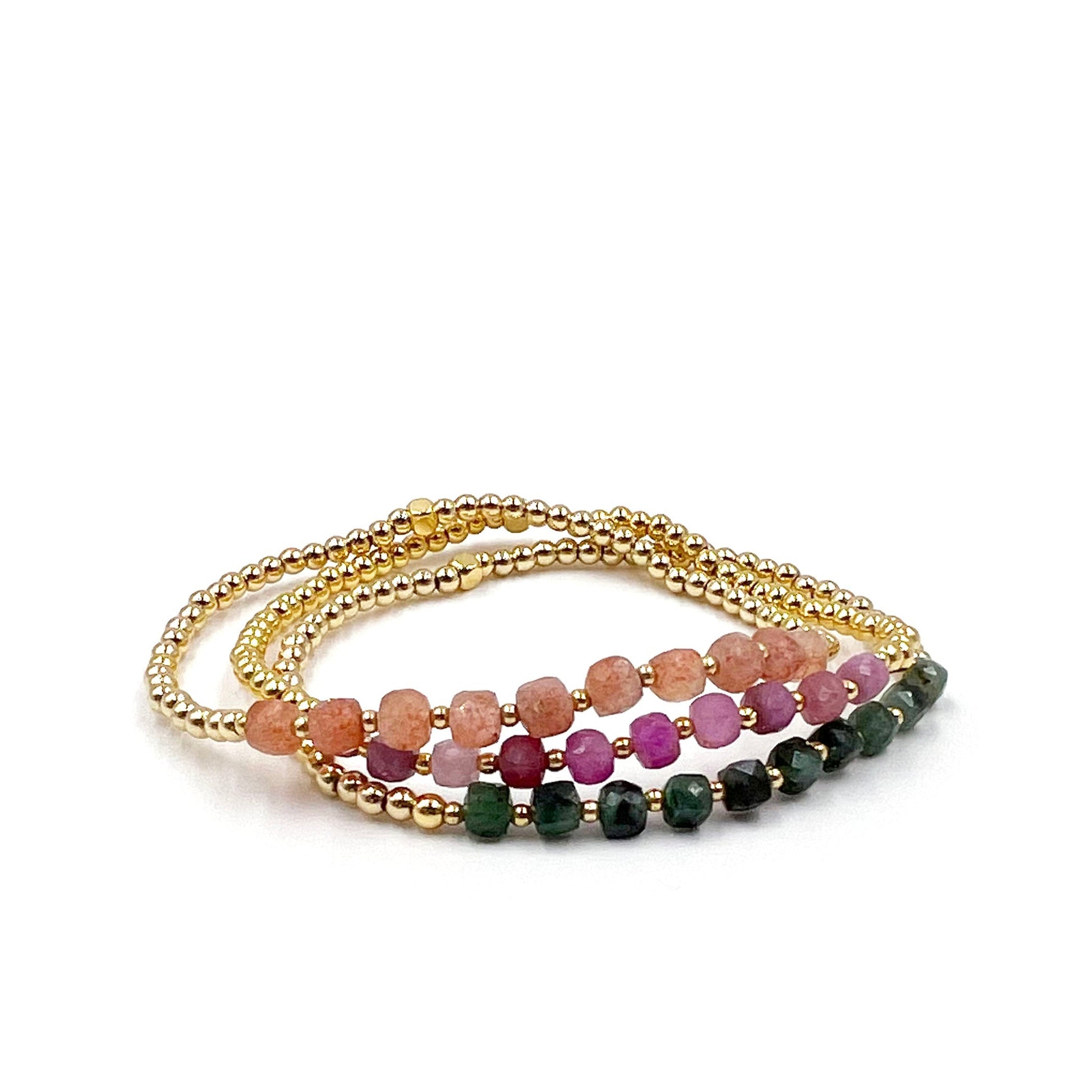 This Cherlandina Gold Bracelet is crafted with 14k gold plated beads and your choice of genuine gemstones—either emerald, ruby or sunstone. It's stackable, simple, yet delicate and beautiful. Enhance your look with this luxurious piece.