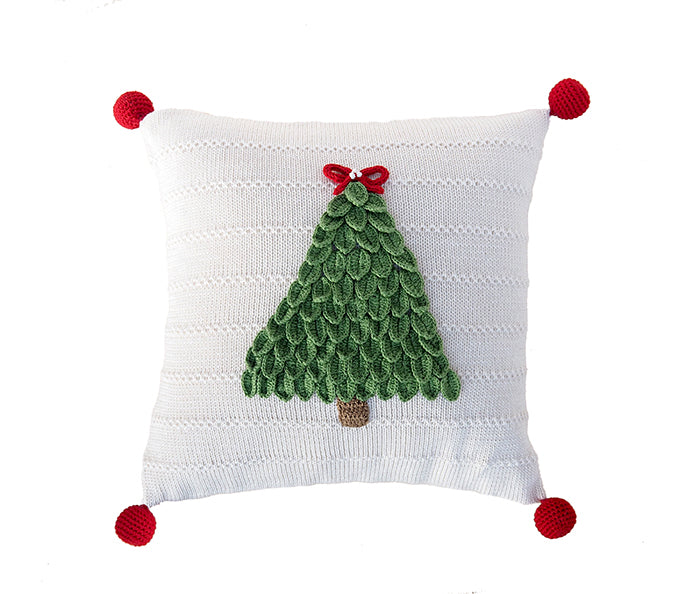 This knit holiday throw pillow brings a festive charm to your home decor. The pillow features beautifully detailed crochet Christmas tree boughs, complete with a red bow at the top, set against a soft ivory background. Red pom-poms on each corner add a playful touch, making this pillow a perfect accent for your living room or bedroom during the holiday season. Whether placed on a couch or a favorite chair, this pillow adds a cozy and joyful element to your holiday celebrations.