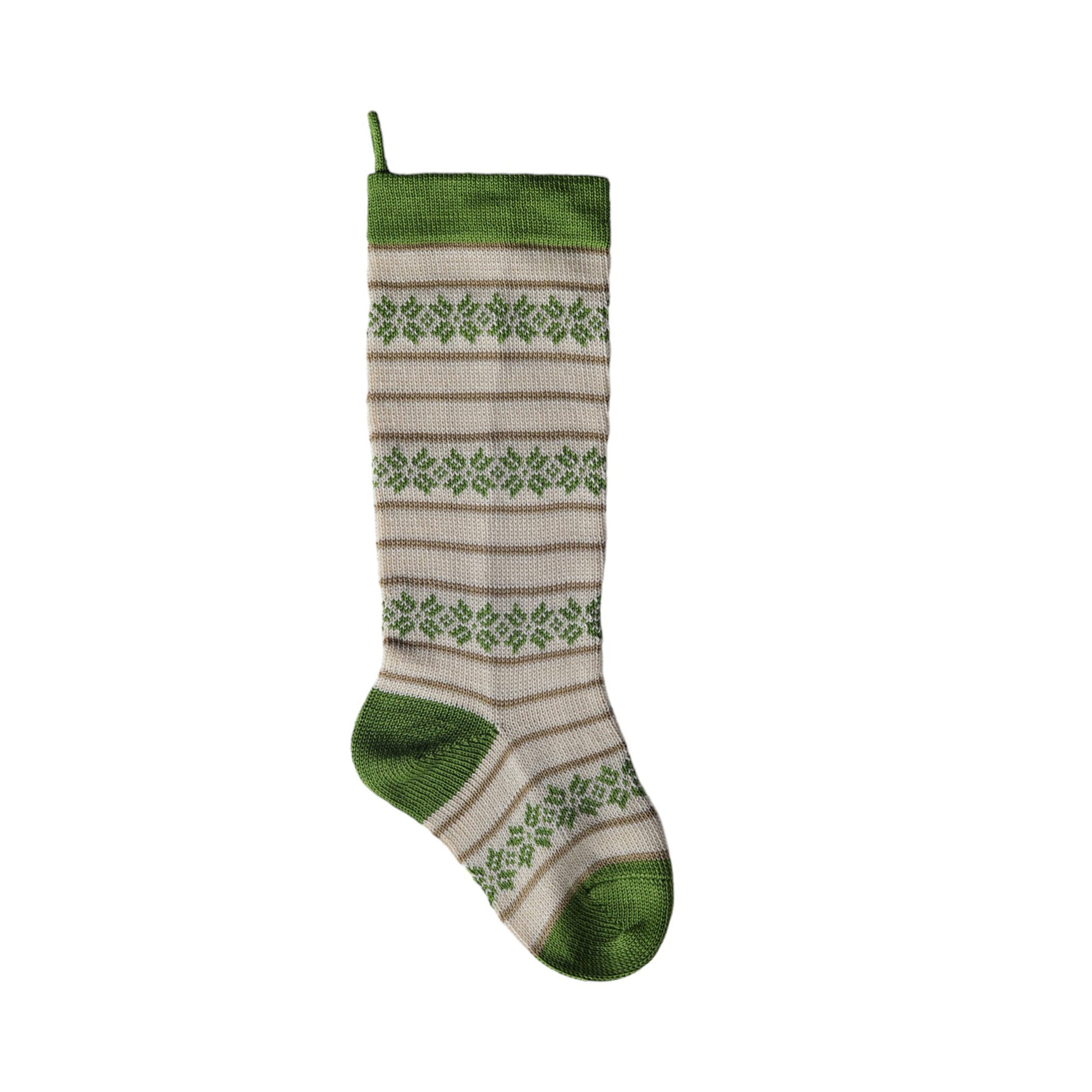 Featuring a sophisticated geometric pattern in tan and cream with delicate green accents, this stocking exudes timeless style. The bold green cuff, heel, and toe provide a striking contrast, making it a standout piece. Its intricate design and soft color palette make it a versatile addition to any holiday setting, blending seamlessly with both traditional and modern décor.