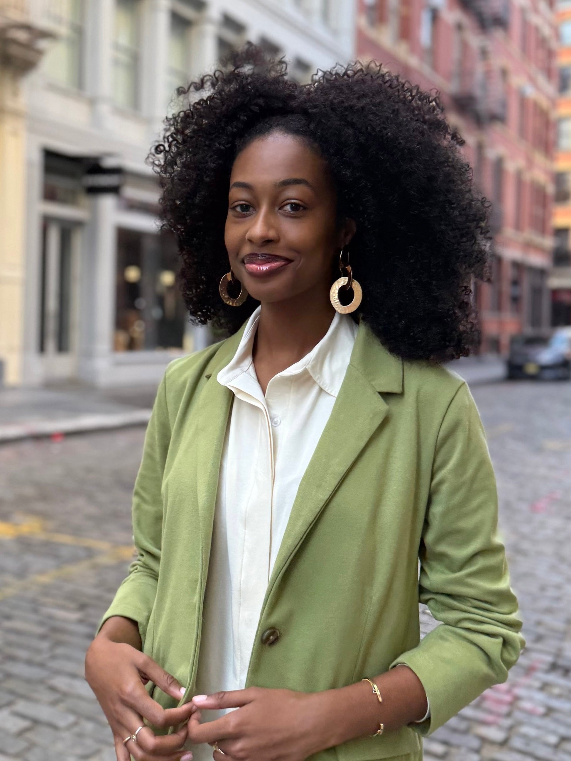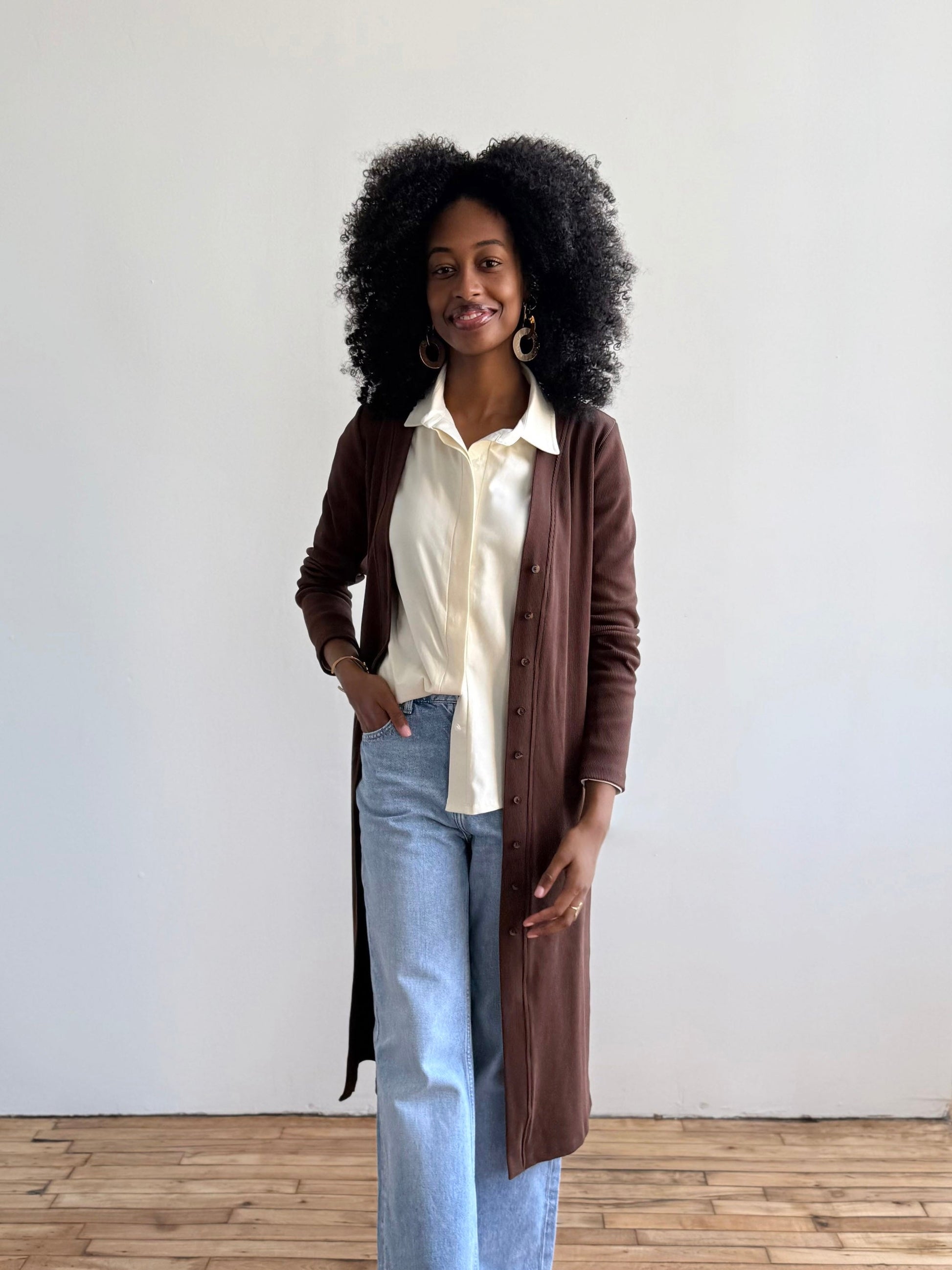 Lindsey designed this with all her favorite features in button down blouses — flowy, sleek front, hi-low hem in back, covered buttons, and a slightly oversized look for a fashion-forward blouse that can be worn tucked, untucked, or half tucked for maxim wear. Pair with the Octavia blazer and jeans for a timeless fall look, or the Octavia blazer and Kenna pants for work, or finally with the Elena dress worn open as a duster and jeans for cozy fall layers.