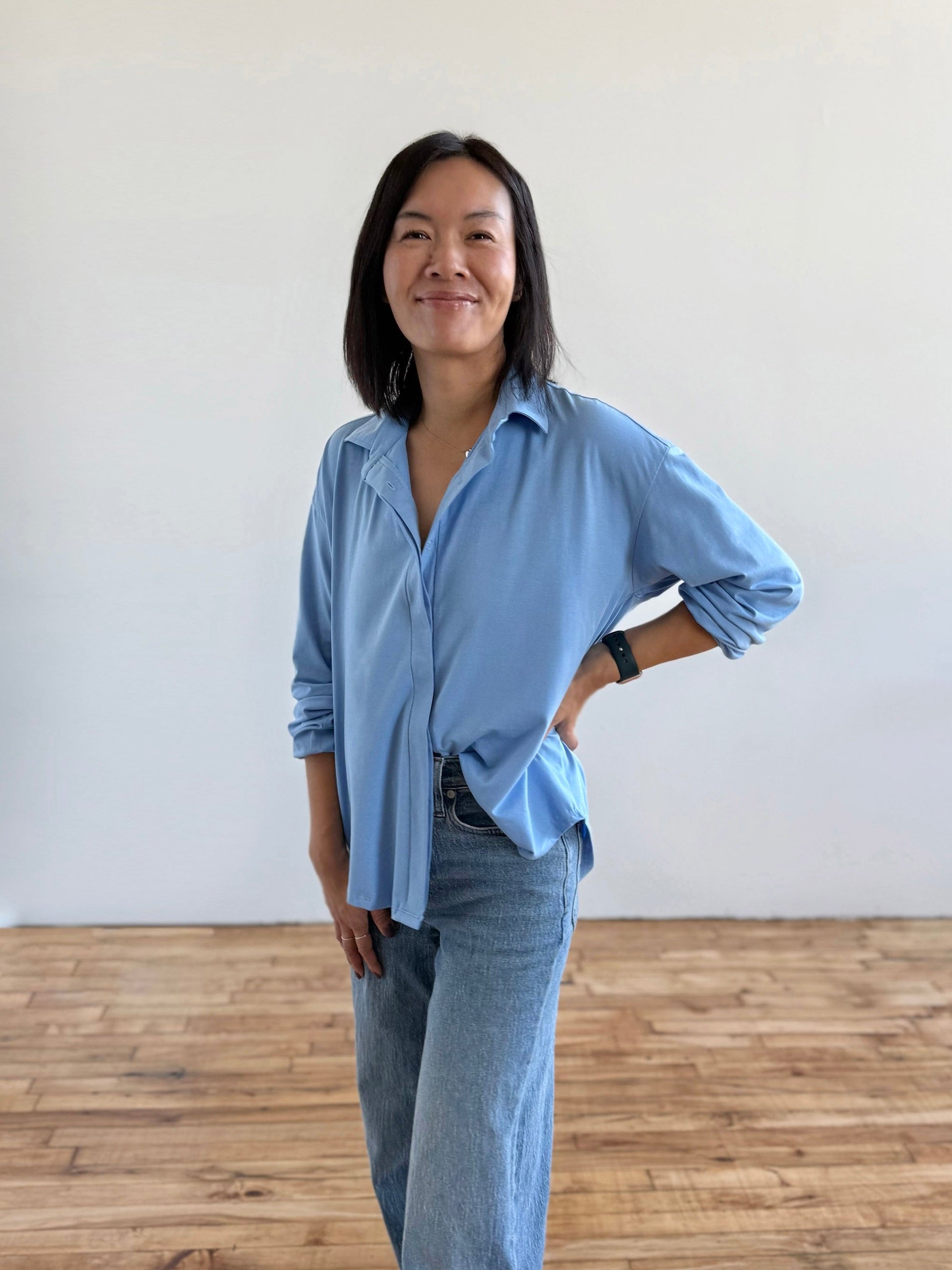 Lindsey designed this with all her favorite features in button down blouses — flowy, sleek front, hi-low hem in back, covered buttons, and a slightly oversized look for a fashion-forward blouse that can be worn tucked, untucked, or half tucked for maxim wear. Pair with the Octavia blazer and jeans for a timeless fall look, or the Octavia blazer and Kenna pants for work, or finally with the Elena dress worn open as a duster and jeans for cozy fall layers.