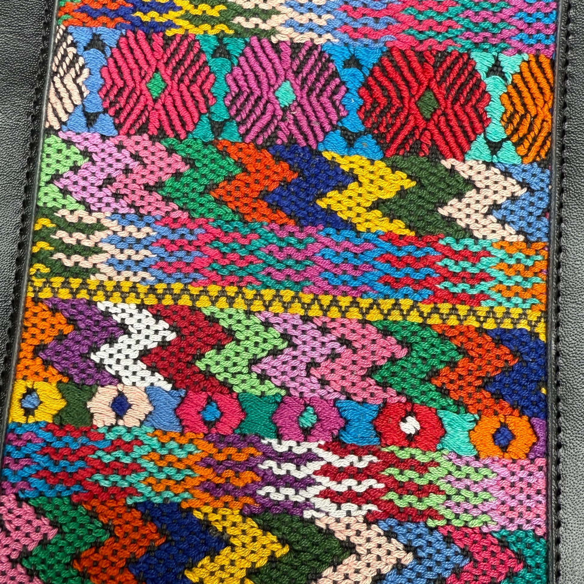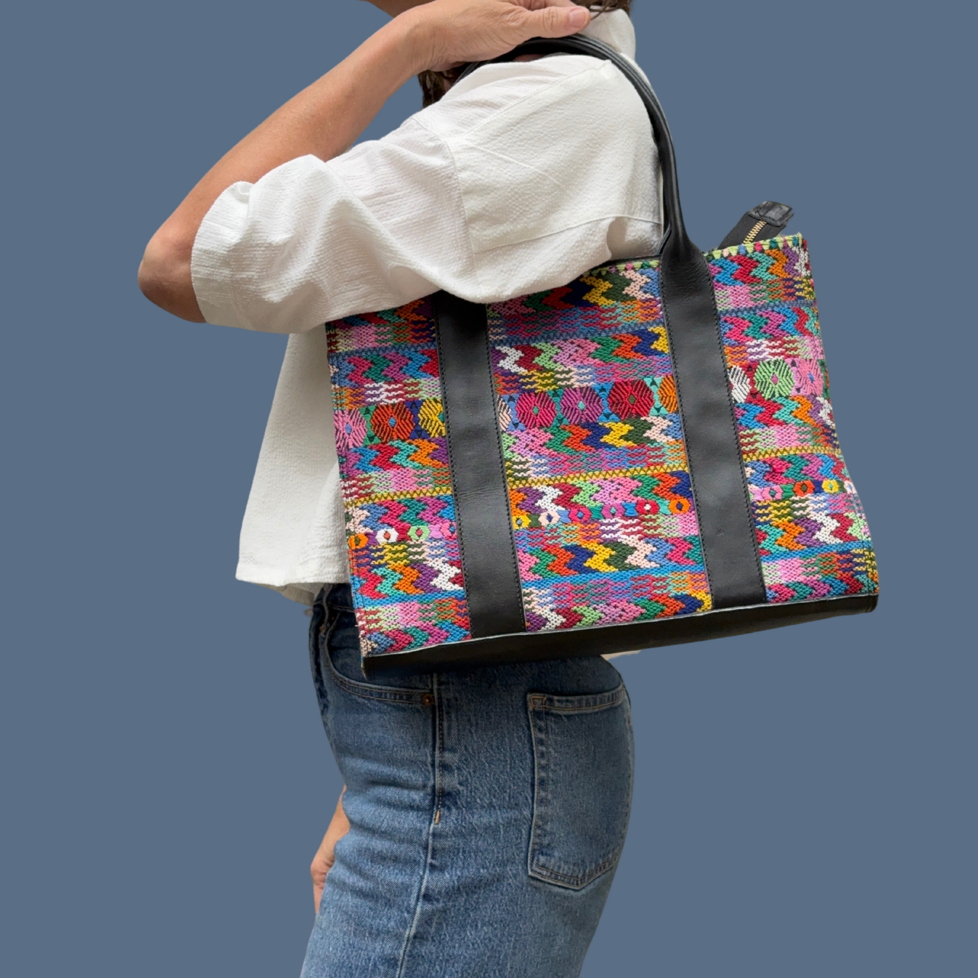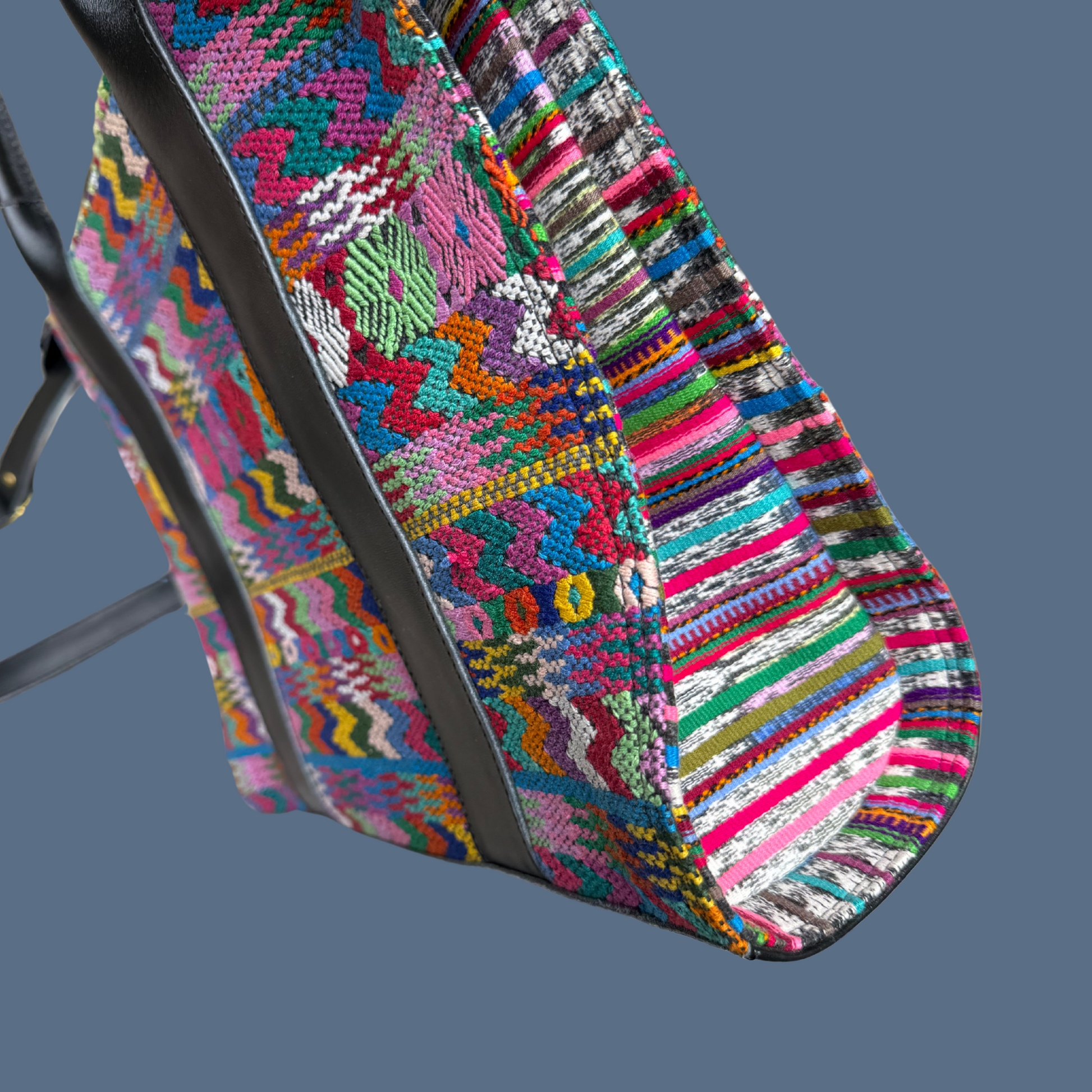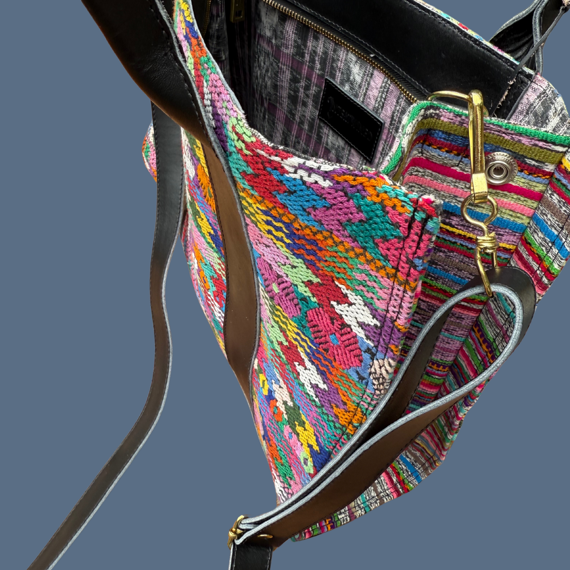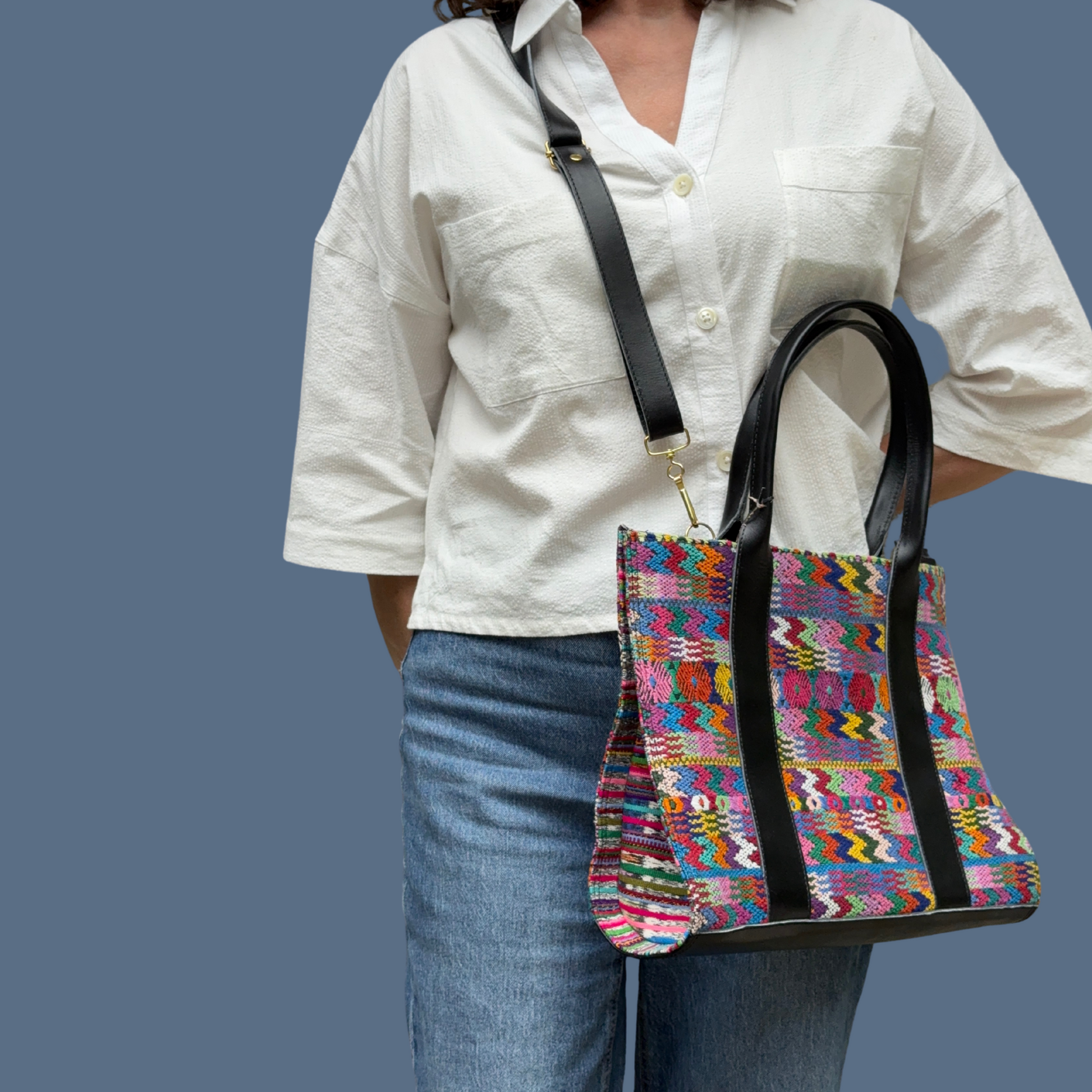 Intertwined's huipil tote bag is sustainably crafted from a repurposed huipil, a handwoven blouse worn by Mayan women in Guatemala. Cuero Malec, a Guatemalan leather shop, upcycles these huipiles by creating stunning, sturdy, handmade artisan bags. It's a unique fusion of classic design and contemporary eco-fashion! The tote can be expanded with side snaps and an adjustable crossbody strap adds even more versatility. The interior is lined with handwoven fabric as well, and a top zipper keeps everything safe!