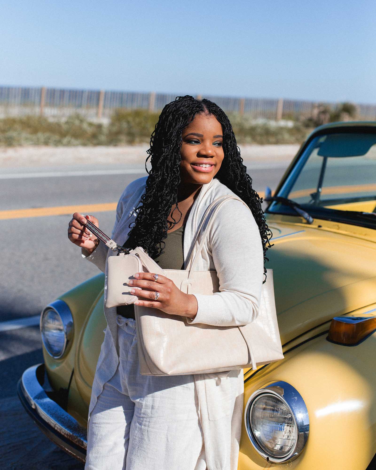 Approx. Measurements: Coin Purse: 3 1/4" H x 4 3/4" W. Zippered Card Pouch: 3 1/2" H x 7 3/4" W, 2 Card Slots. Removable wristlet strap: 8 1/4” Materials: Vegan Leather, Antique Brass Hardware Color: Cream, Yellow, White, Black, Turquoise, Rose, Antique brass