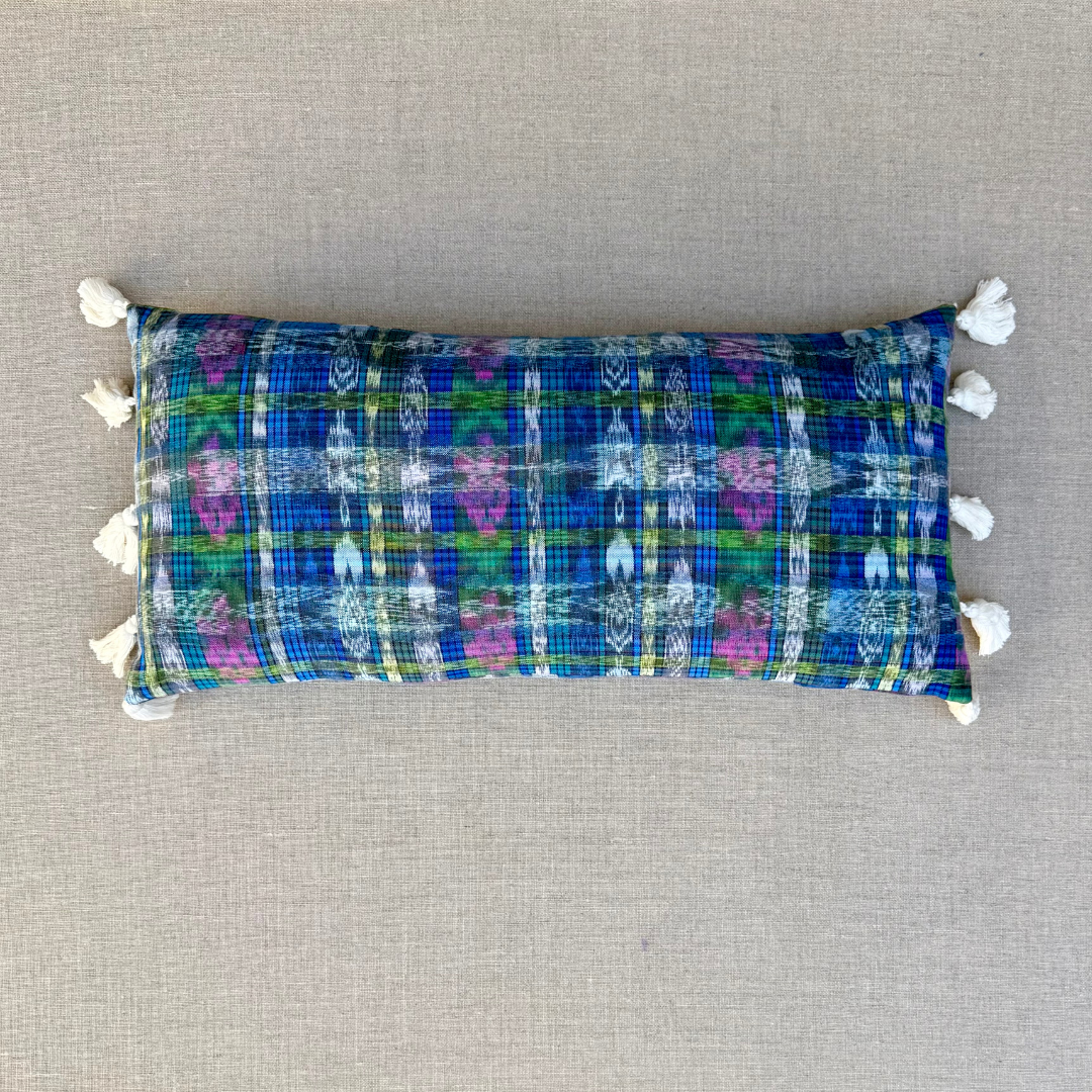 Spruce up your home with a touch of Guatemalan culture. This playful throw pillow boasts a handwoven and hand-dyed fabric, originally a traditional corte skirt. The zippered back and down/feather insert make cleaning a breeze, while the tassels add a charming touch.