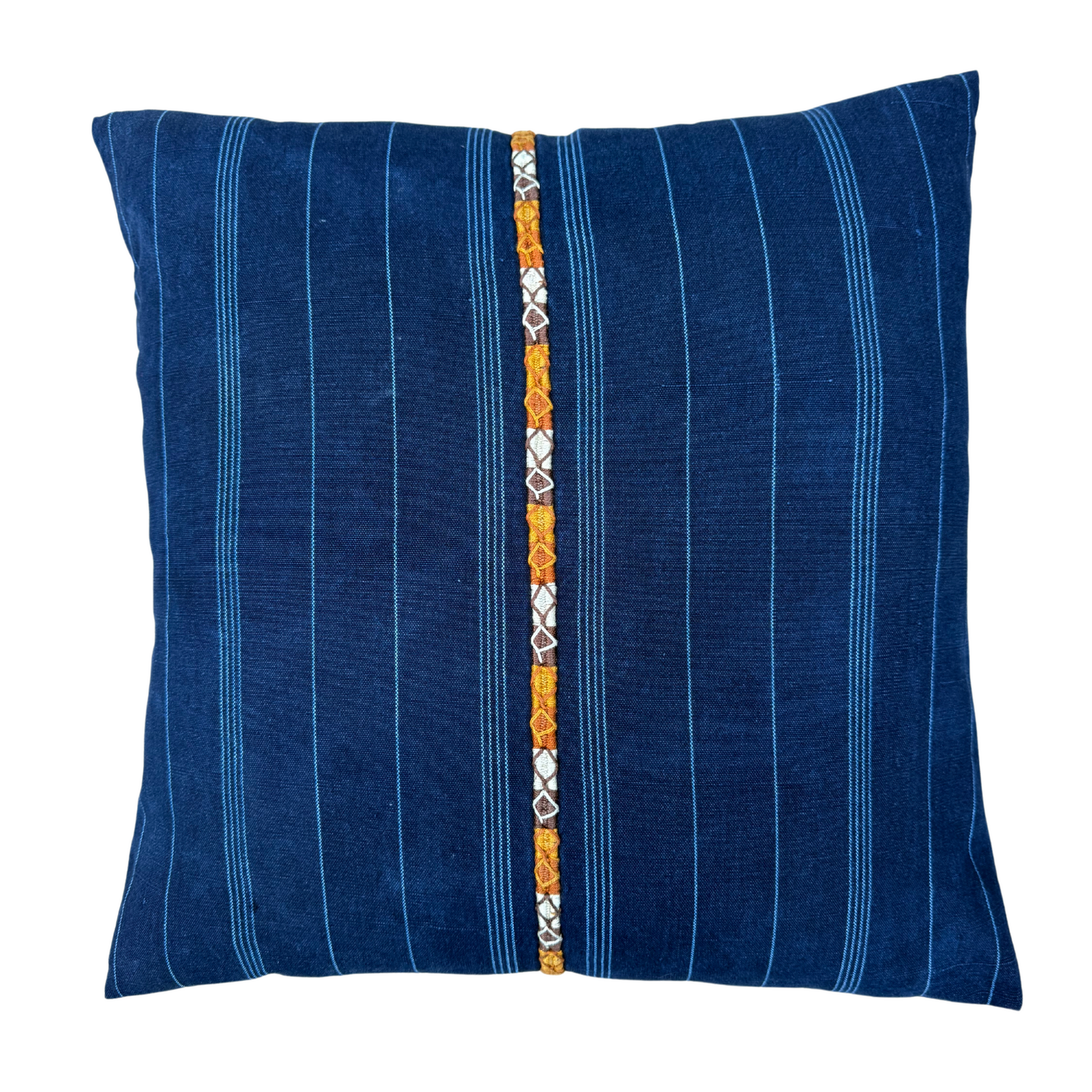 Add a touch of culture and sustainability to your home with Intertwined's handwoven vintage indigo pillow made from a traditional Mayan corte skirt. Embroidered accents and expert tailoring by Ruth & Naomi in Guatemala make this a unique and cheerful addition to your sofa or bed.