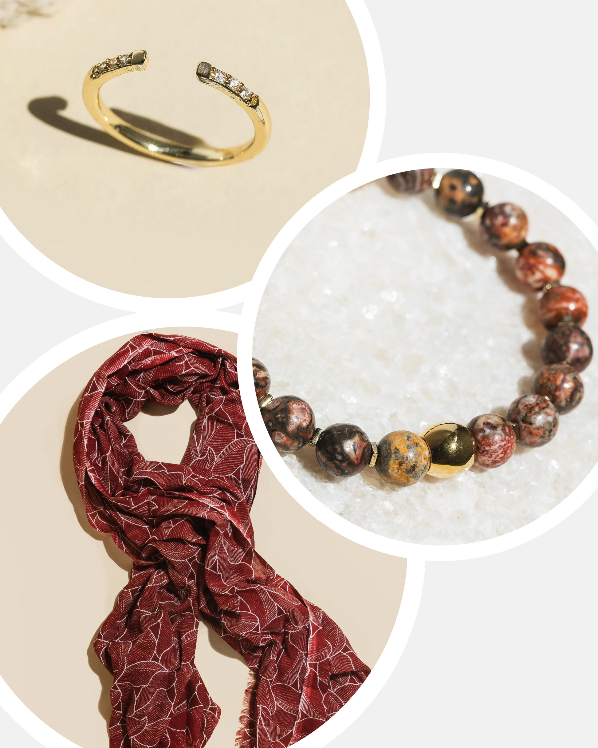 Approx. Measurements: Elva Rose Bracelet: Stretch 6 3/4". Gabi Ring: Adjustable Ring Size 7. Elva Scarf: 39 1/2" W x 70 3/4" L Materials: Elva Rose Bracelet: Jasper Stone beads, 18K Gold-plated stainless steel. Gabi Ring: 18k gold-plated brass, Cubic zirconia. Elva Scarf: Cotton Color: Elva Rose Bracelet: Rust, Brown, Burgundy, Orange, Gold. Gabi Ring: Gold, White. Color: Rust, White Care Instructions: Scarf: Hand wash in cold water. Lay flat to dry.