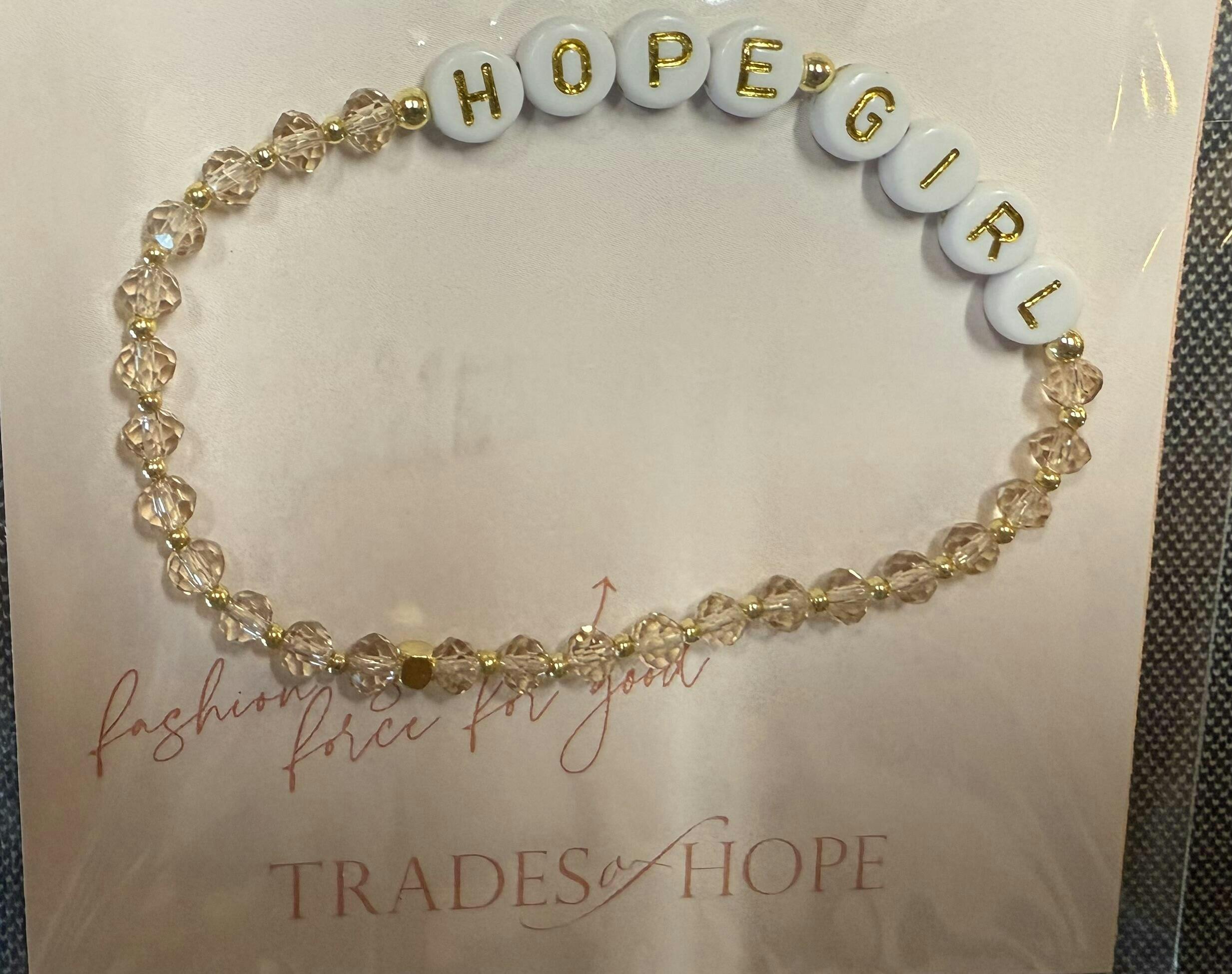 Create hope for human trafficking survivors in the Dominican Republic when you wear your Hope Girl bracelet! This adorable friendship-styled bracelet beautifully represents our partnership with these young women, who were once trafficked themselves, and who now earn a dignified income in a safe working environment by creating this Hope Girl Bracelet. Each stretch-to-fit bracelet features champaign colored faceted crystal beads and gold-tone letter beads that spell out "Hope Girl".