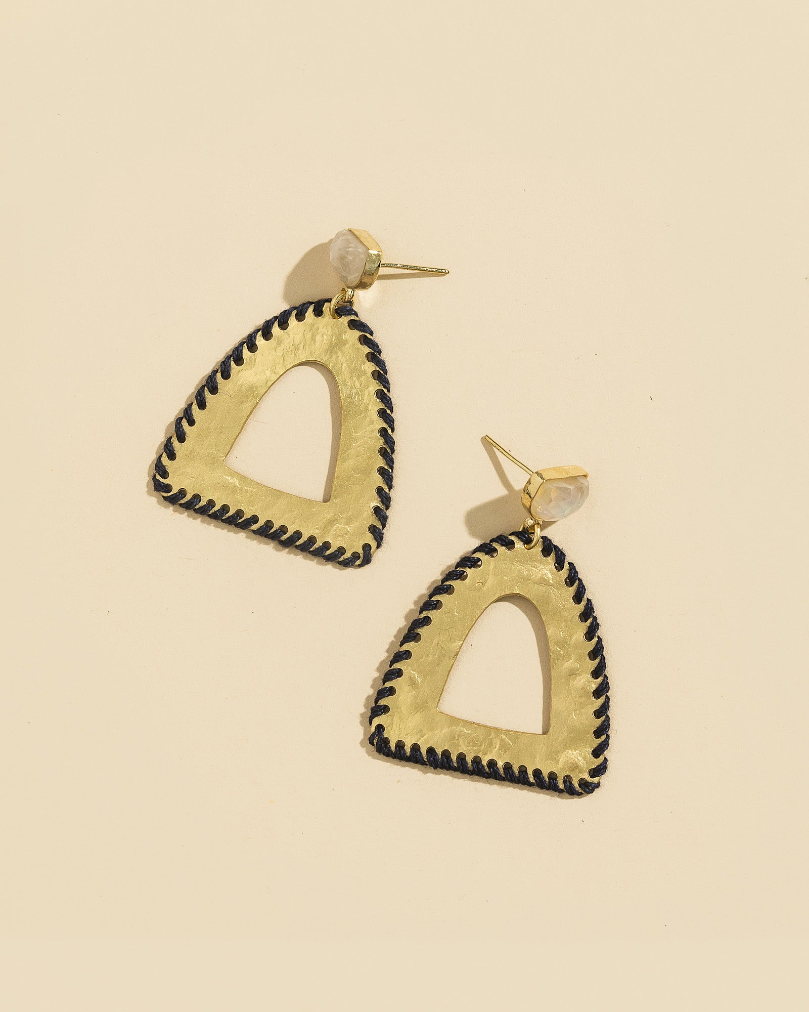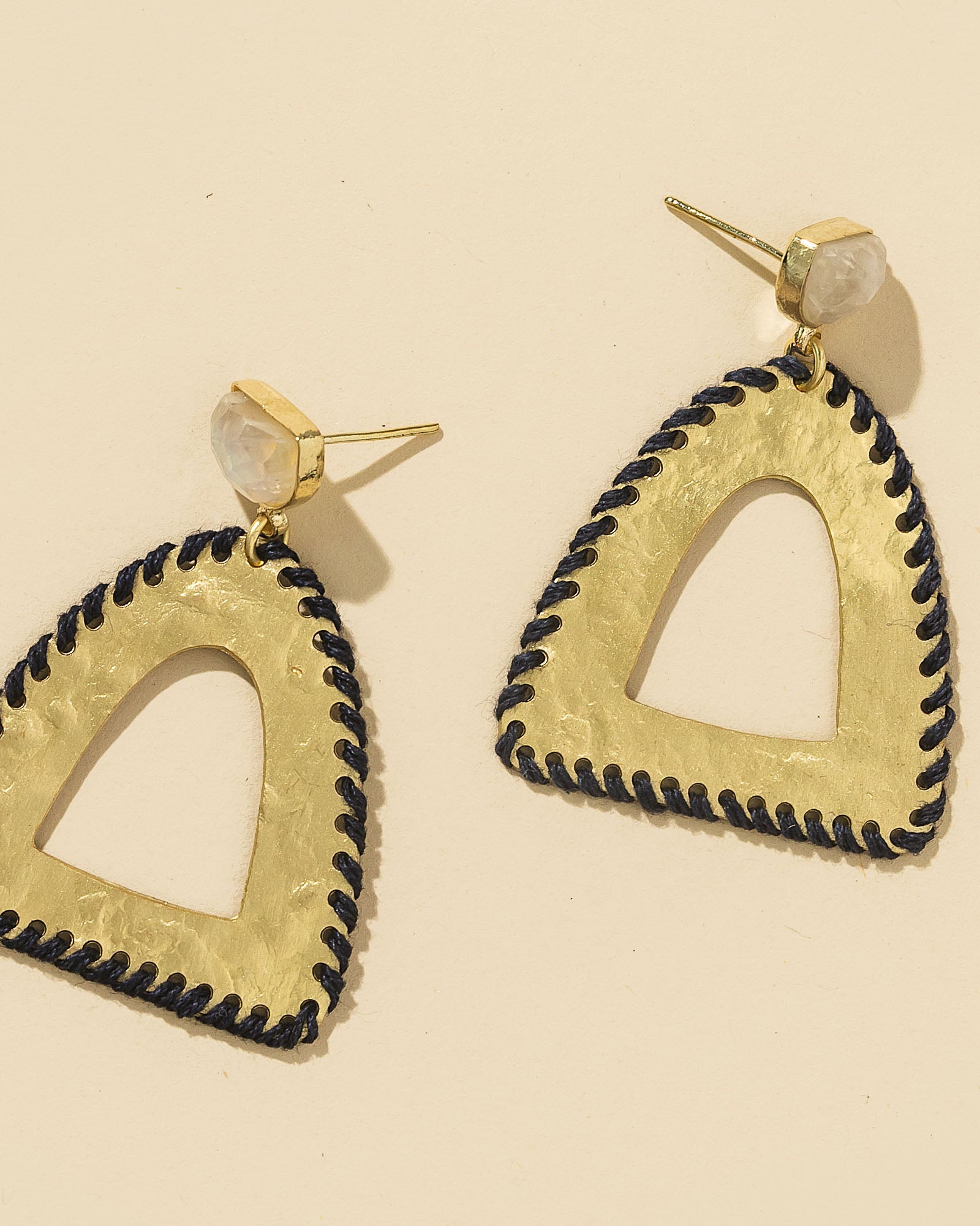 Approx. Measurements: 1 3/4" Materials: Brass, Moonstone, Cotton thread Color: Gold, Navy, White
