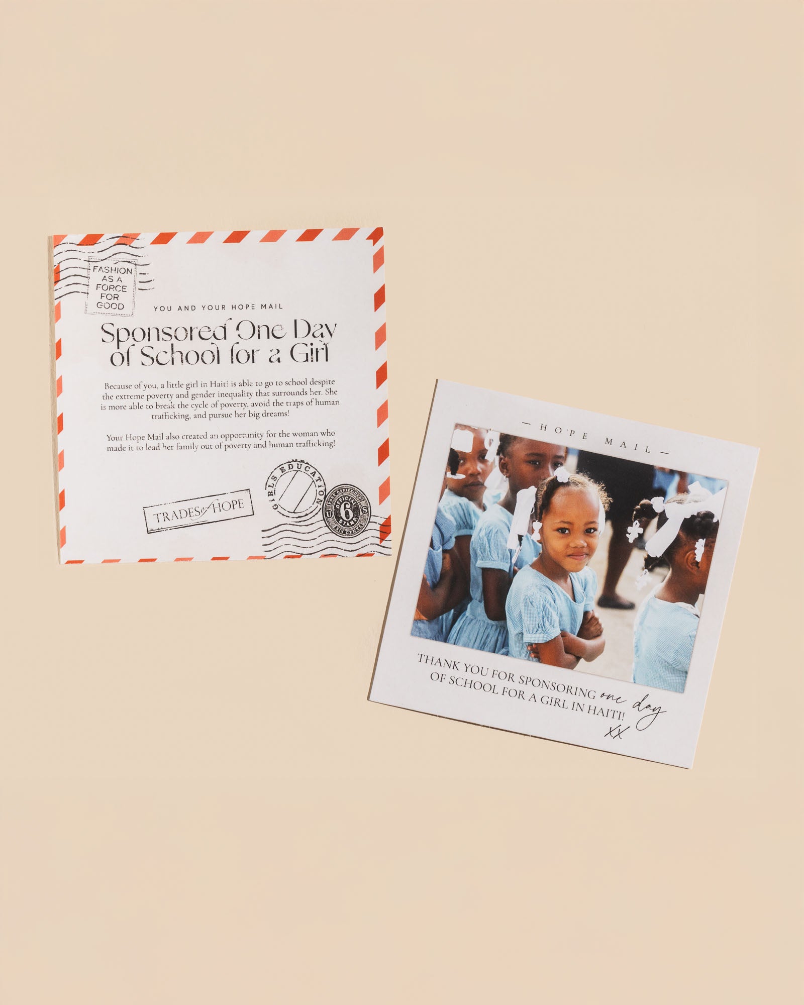 Your purchase of October Hope Mail provides one day of school for a girl in an area of extreme poverty.