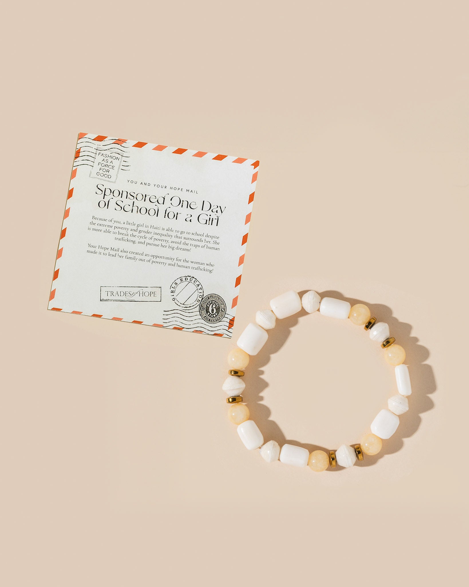 This exclusive October Hope Mail package makes a great gift for any occasion! The beautiful Nambi Light Bracelet is handmade by women in Uganda. Featuring handmade paper beads painted in cream, ethically sourced bone beads, and gold-tone accent beads. Every October Hope Mail creates necessary jobs for women and mothers in areas of extreme poverty in Uganda!