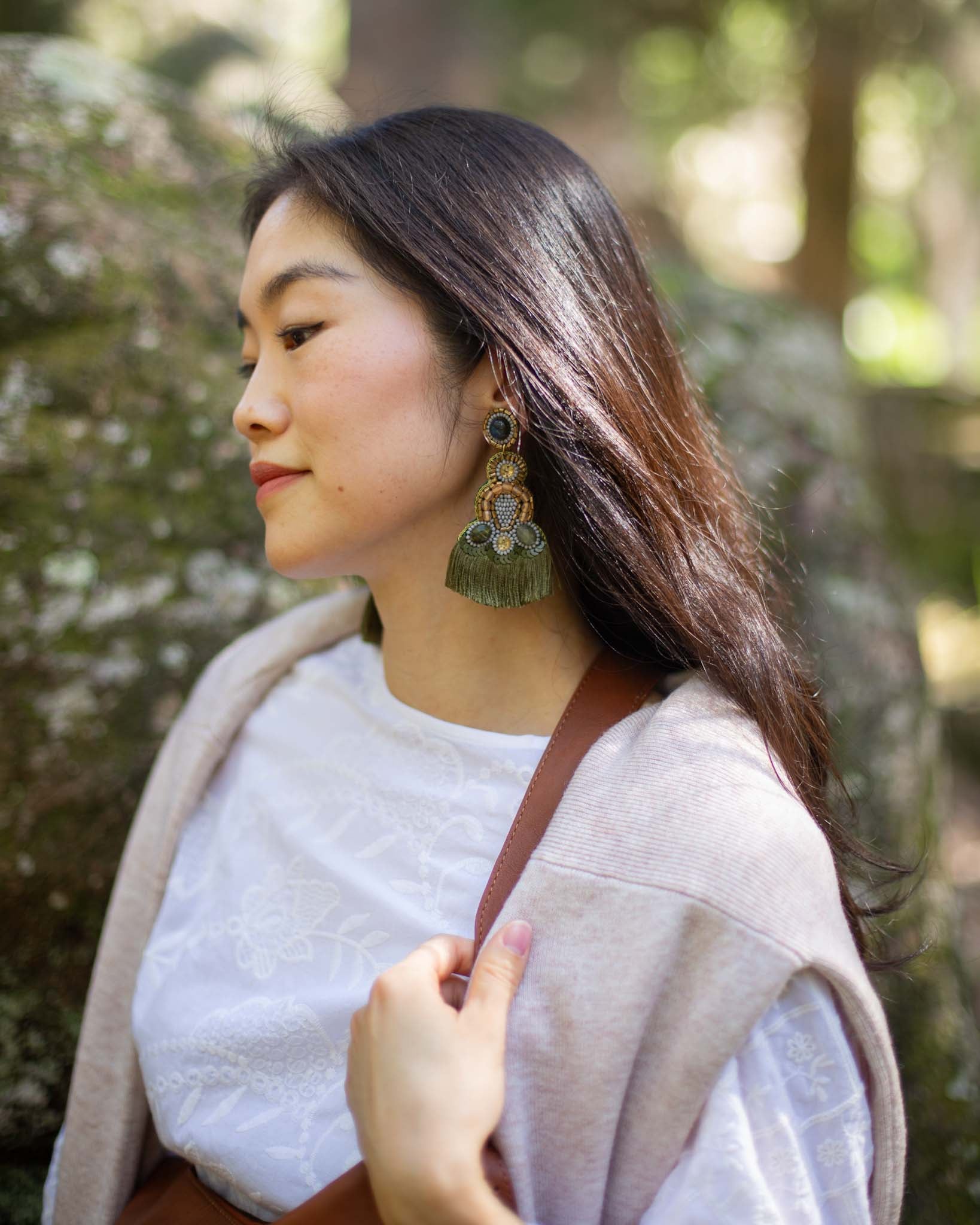 Purchase these gorgeous, beaded fringe earrings that are handcrafted in a workshop in India that’s committed to fighting child marriage and helping women become financially independent as fair-trade Artisans. Each Zora Earring features green, gold, peach, and sequin beads to create a stunning, moody statement earring. These earrings are not only beautiful but also create necessary jobs for women in areas of extreme poverty in India.