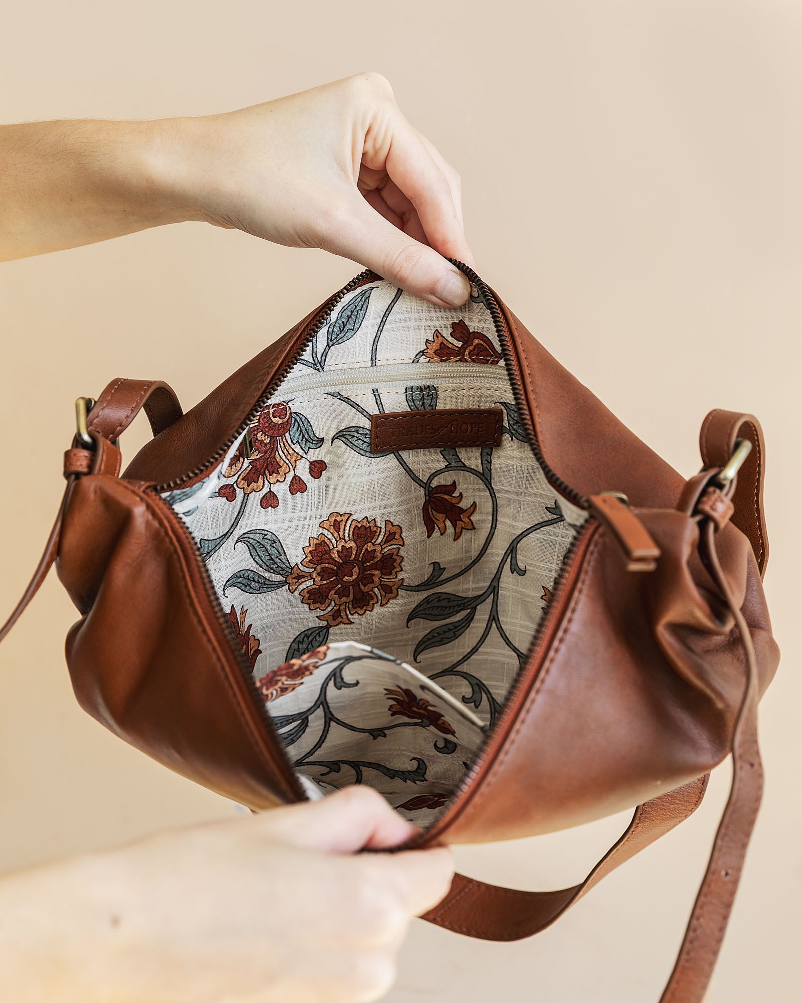Adjustable straps on each side allow you to style it your way, wear it comfortably on the shoulder or as a chic short crossbody. Inside, you’ll find a beautifully screen-printed lining inspired by traditional block print florals of India, with colors that nod to our Fall Collections.