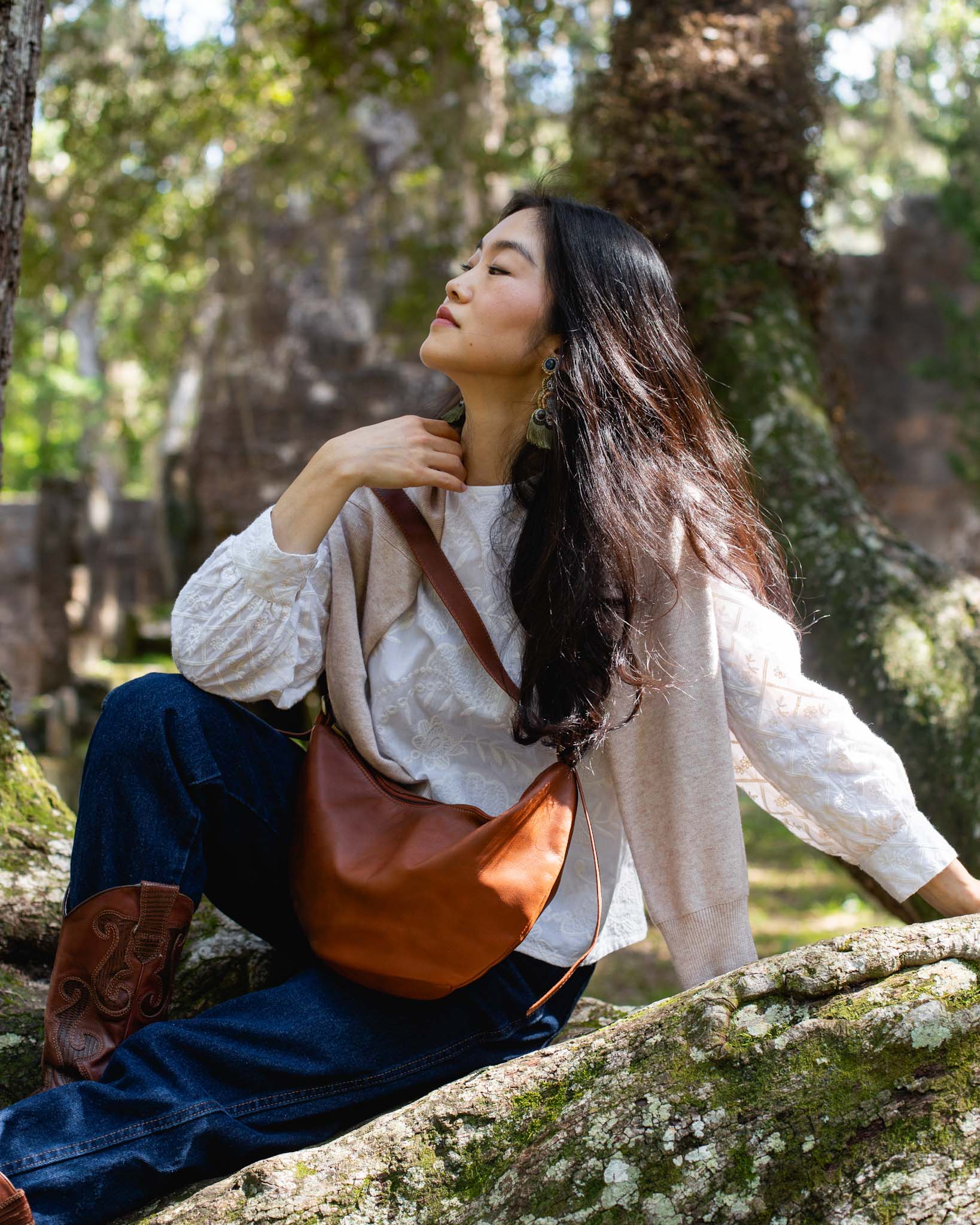 Our new Zora Crescent Bag is crafted from supple sheepskin leather, treated to achieve a smooth, refined finish. Dyed in a rich cognac hue, its warm tones bring timeless elegance to any look. With its sleek crescent silhouette and naturally soft texture, this bag blends modern design with enduring sophistication.