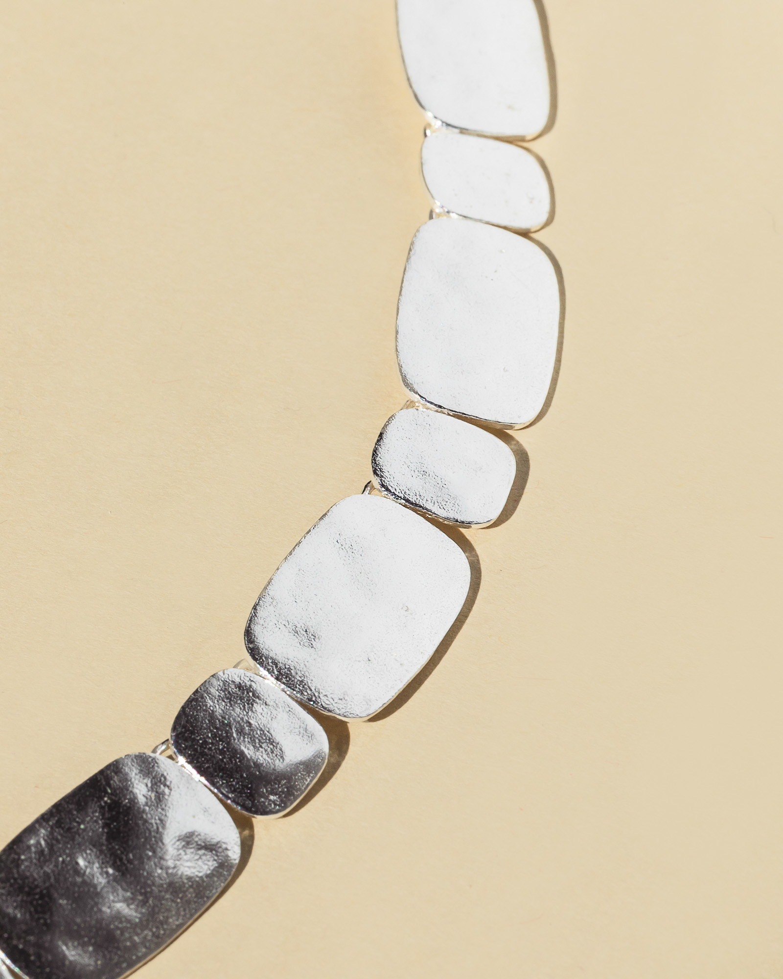 This elegant silver necklace from India will give you the unique jewelry look you desire, creating a standout fair-trade look! Designed to sit close to the base of the neck, the Hera Collar Necklace is beautifully crafted featuring textured shapes and is finished with nylon cording and a lobster clasp closure. This necklace is perfect to create a fair-trade fashion statement! Every purchase provides safe jobs with fair wages in areas of extreme poverty where vulnerable women are often exploited by sweatshops.