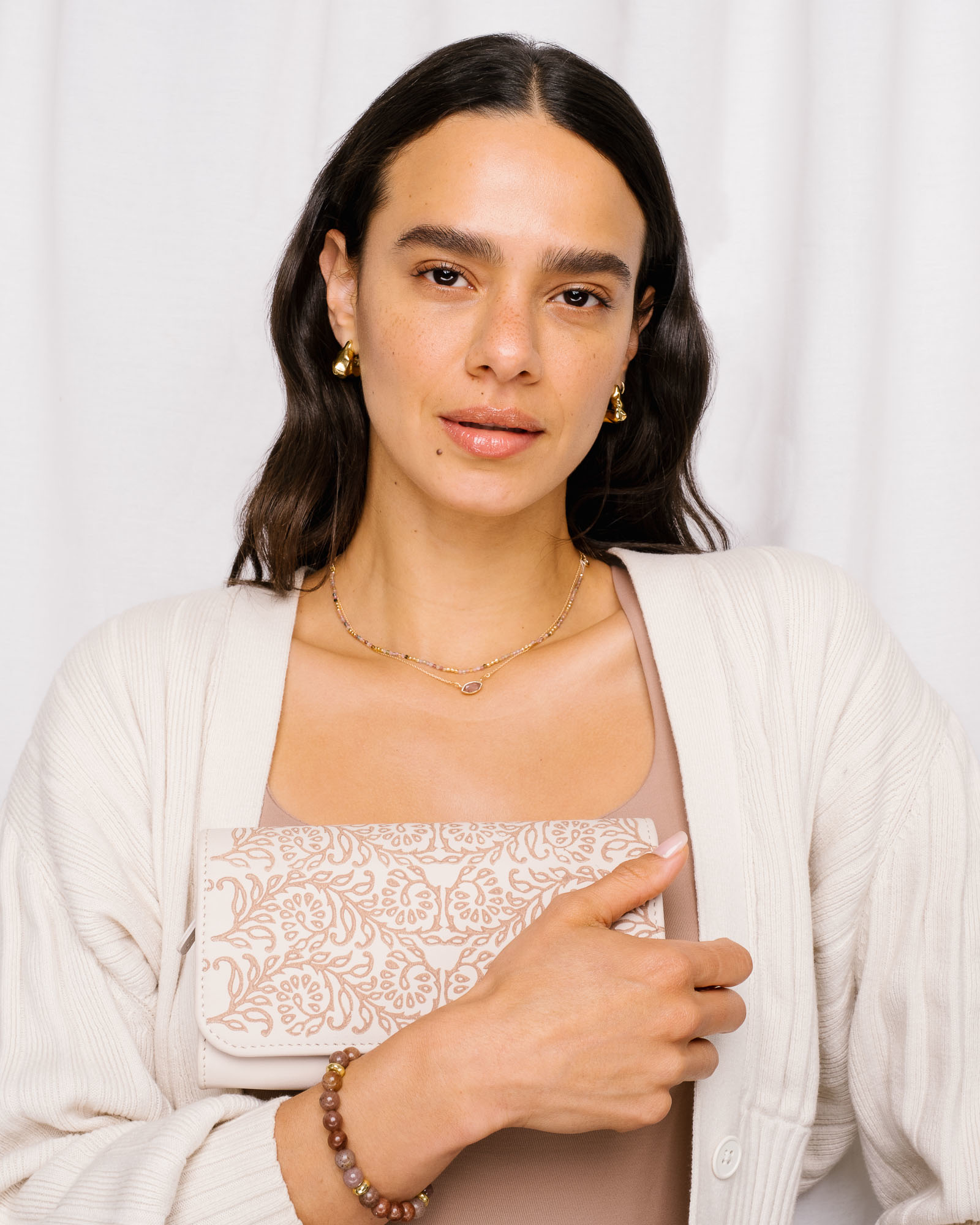 This dainty Noa Necklace features gold-tone beads and tourmaline beads in various shades of pink and green. The Noa Necklace is perfect for daily wear or paired with the Cherry Marquise Necklace for a layered look. Every purchase of the Noa Necklace creates safe jobs for women ending poverty cycles in India and creating the opportunity for them to earn a dignified income.