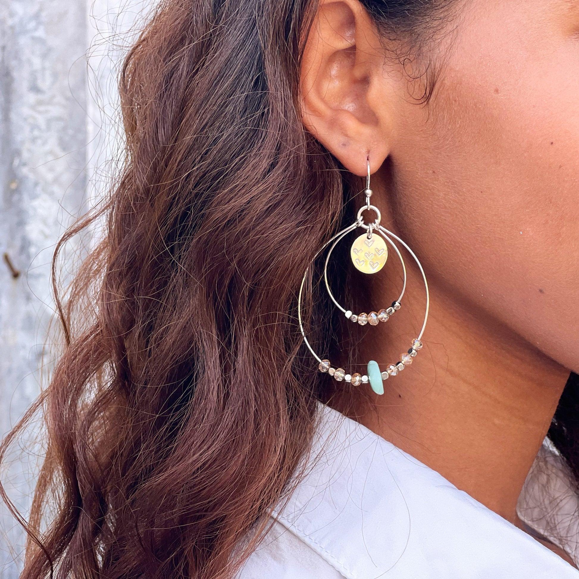 Featuring sterling silver and crystal beads, the Freedom Hoops earrings are the perfect statement piece. Each earring has a hand-stamped disc with a hearts, making it an ideal gift for a loved one. Crafted with superior quality materials, these earrings will be enjoyed for years to come.