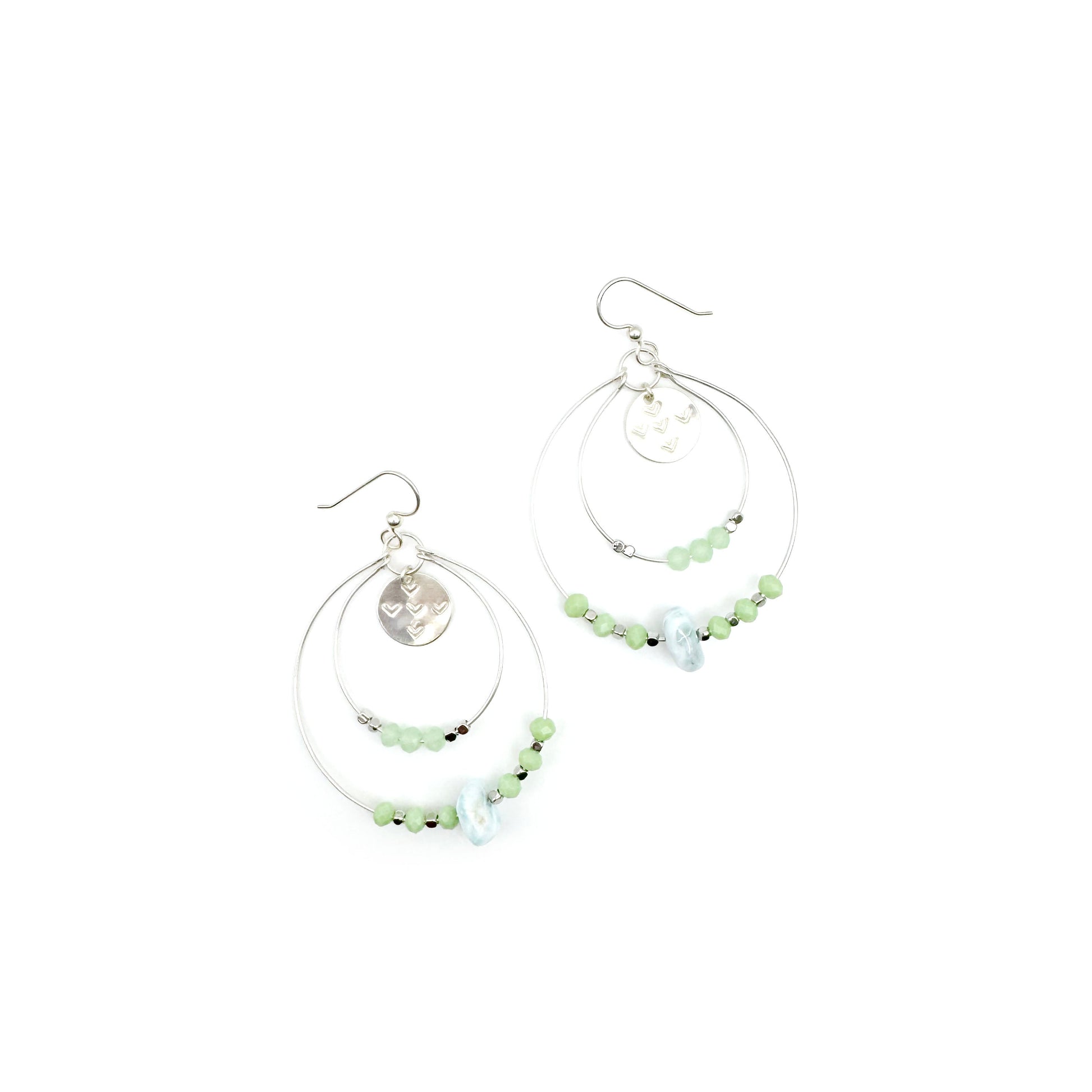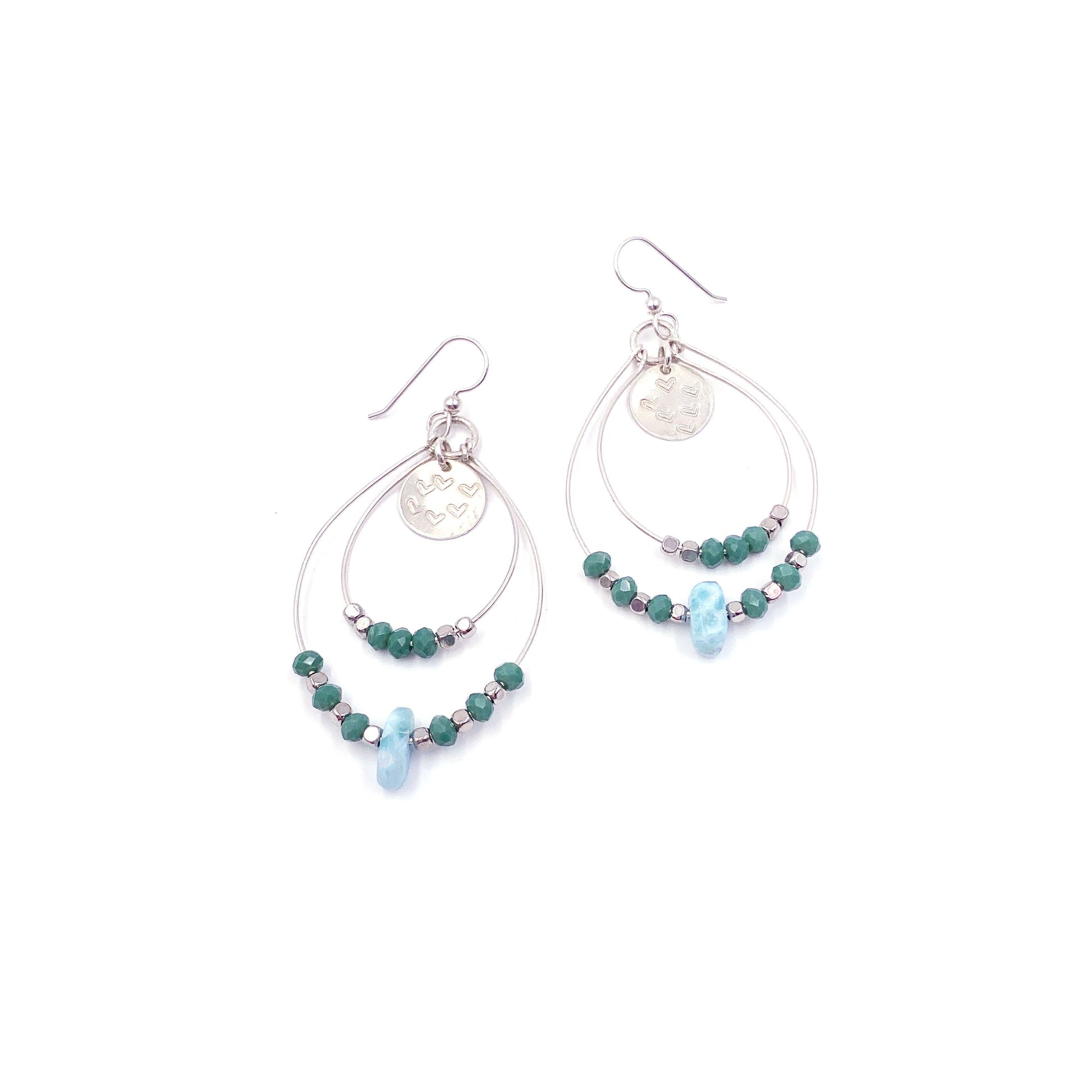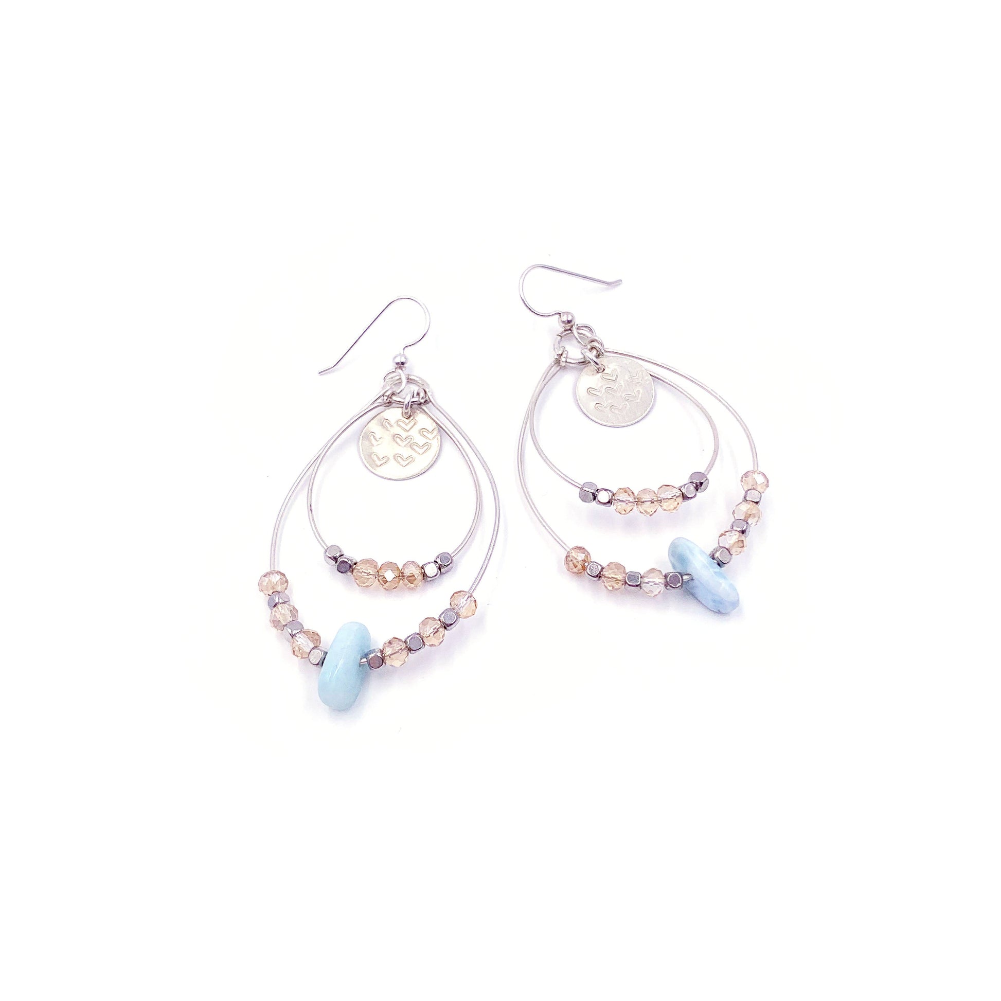 Materials: Sterling silver findings, Larimar, crystal beads and hand-stamped sterling silver disc