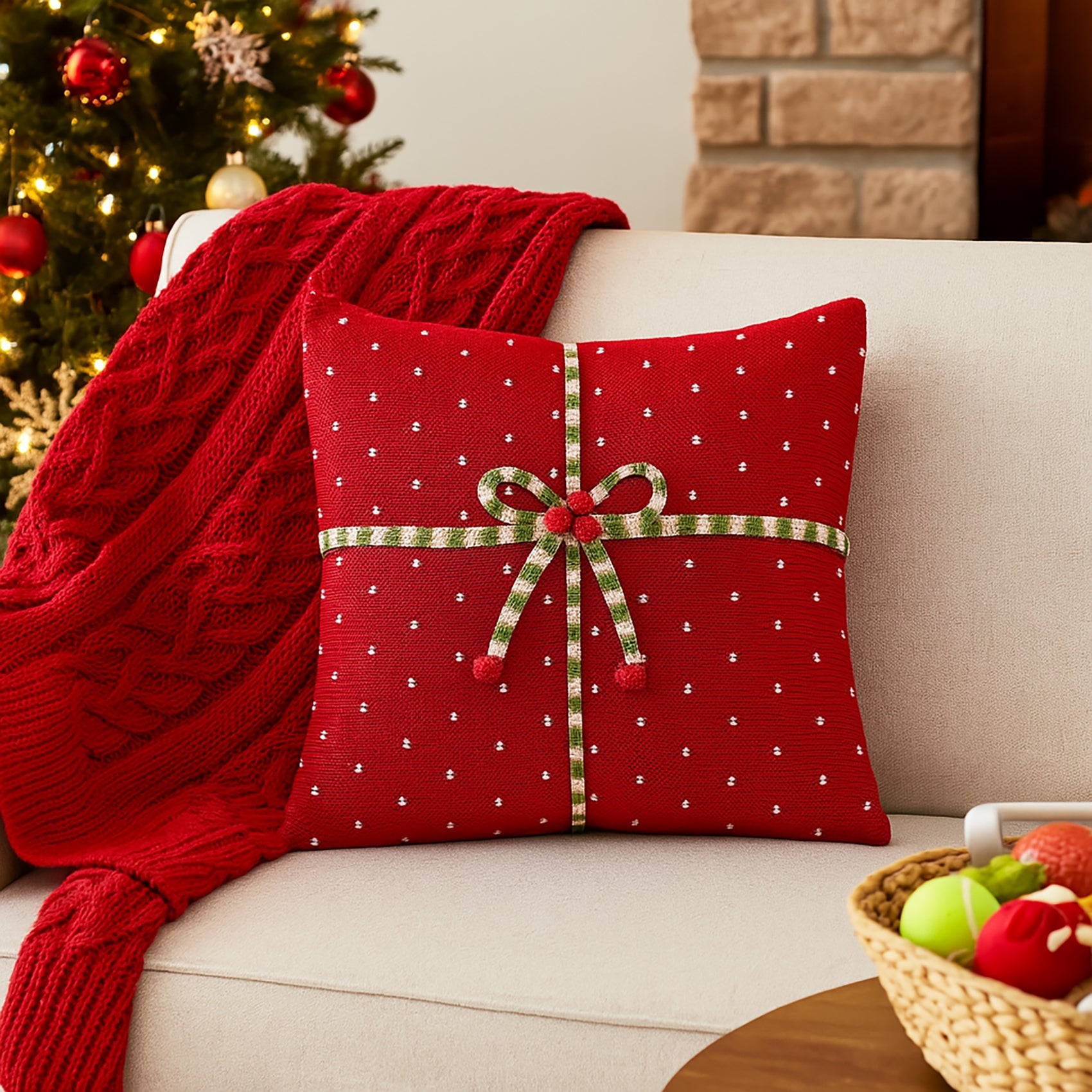 This festive knit holiday throw pillow is designed to bring the joy of the season into your home. With its bright red background and a green-and-white striped bow detail, it resembles a beautifully wrapped present, making it an ideal accent for any room during the holidays. The intricate knit pattern and soft texture add a cozy and inviting feel to your decor, while the vibrant colors ensure it stands out as a festive centerpiece.