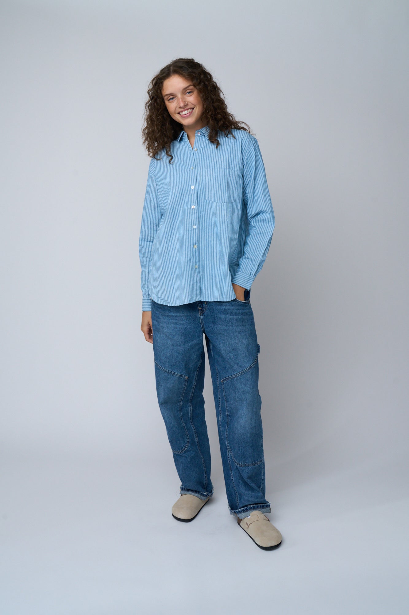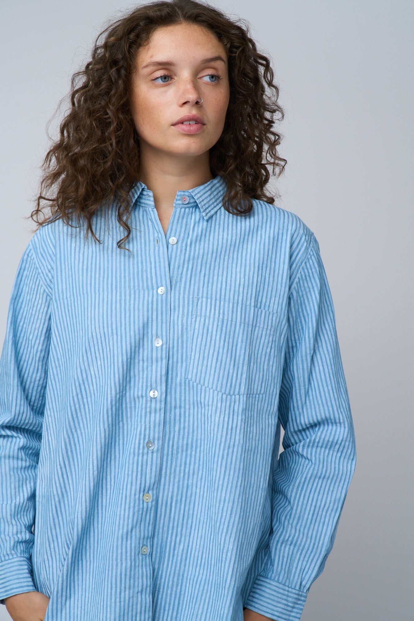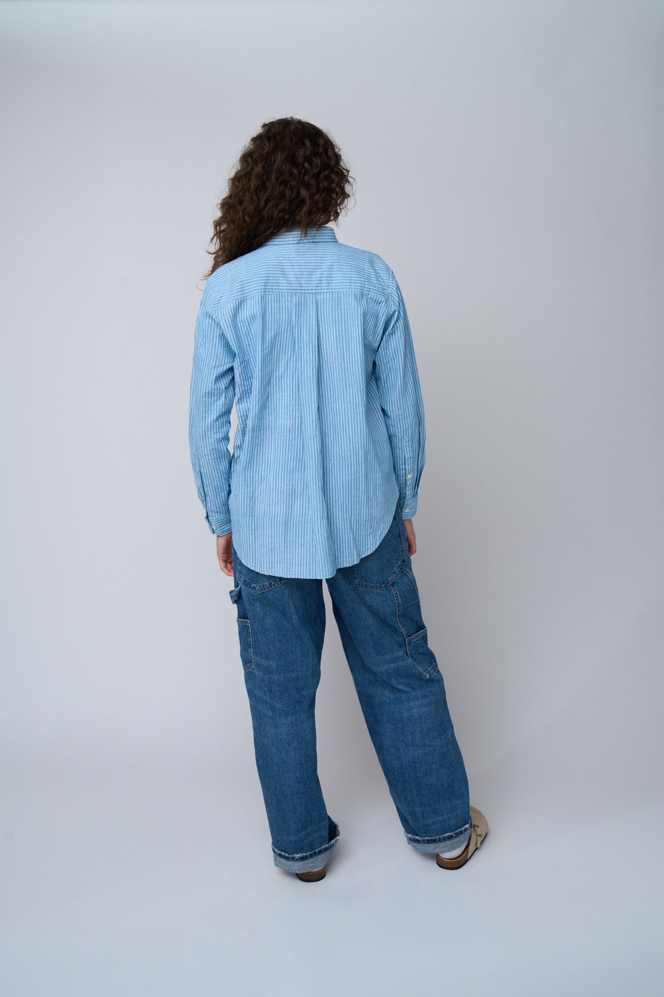The good boyfriend long sleeve button down shirt is a comfortable and effortlessly cool wardrobe staple with a sustainable story. From its origin of GOTS certified organic cotton in natural fields, to the hand loom processing, artisan crafted block from carved wood to hand stamp the stripe print, hand construction and sewing of garment; the entire lifecycle of production is sustainable and keeps the heritage of artisan practices alive. With its relaxed, modern fit, and casual silhouette, the good boyfriend shirt offers endless styling options and ways to wear this fashionable favorite.