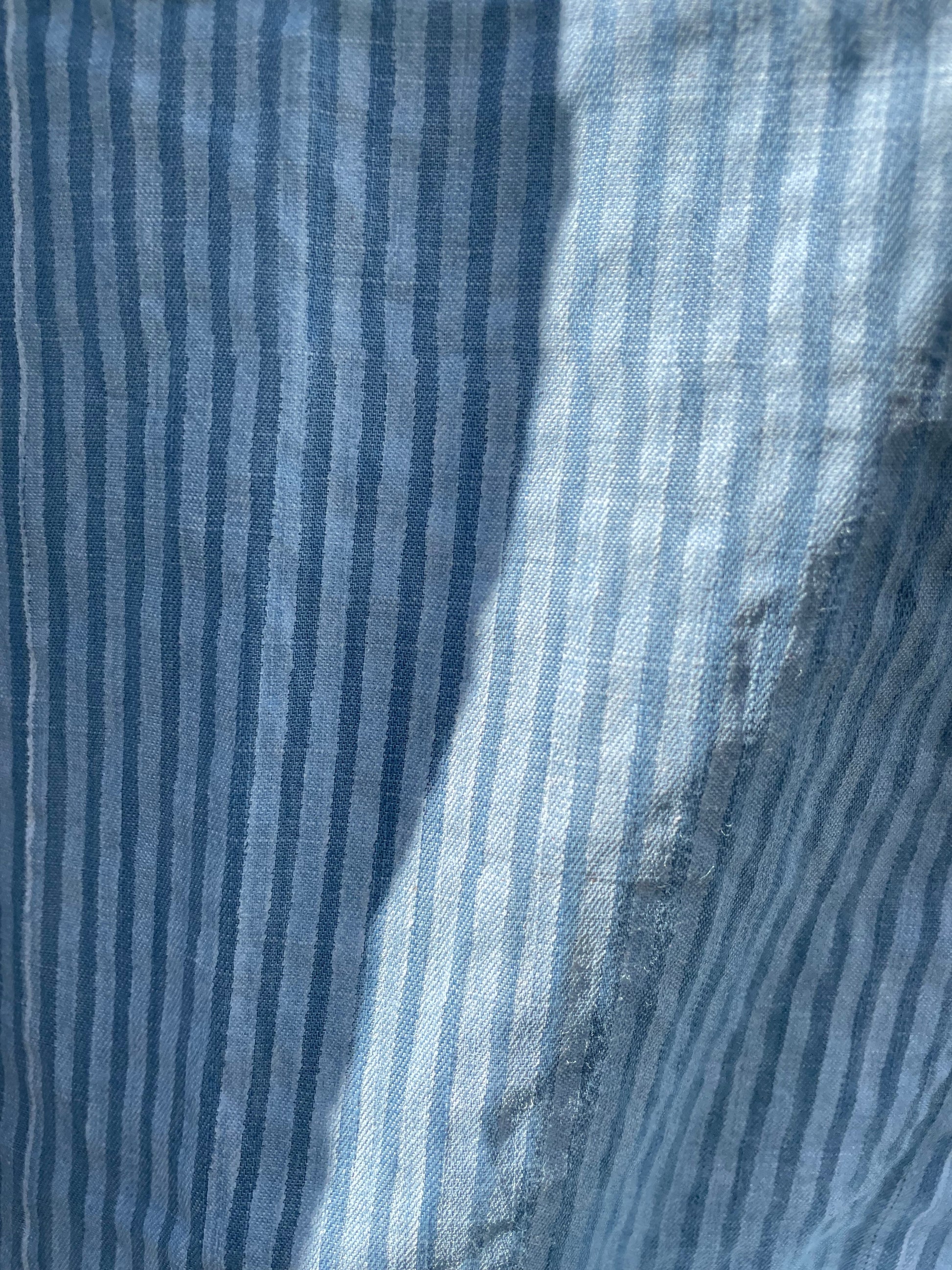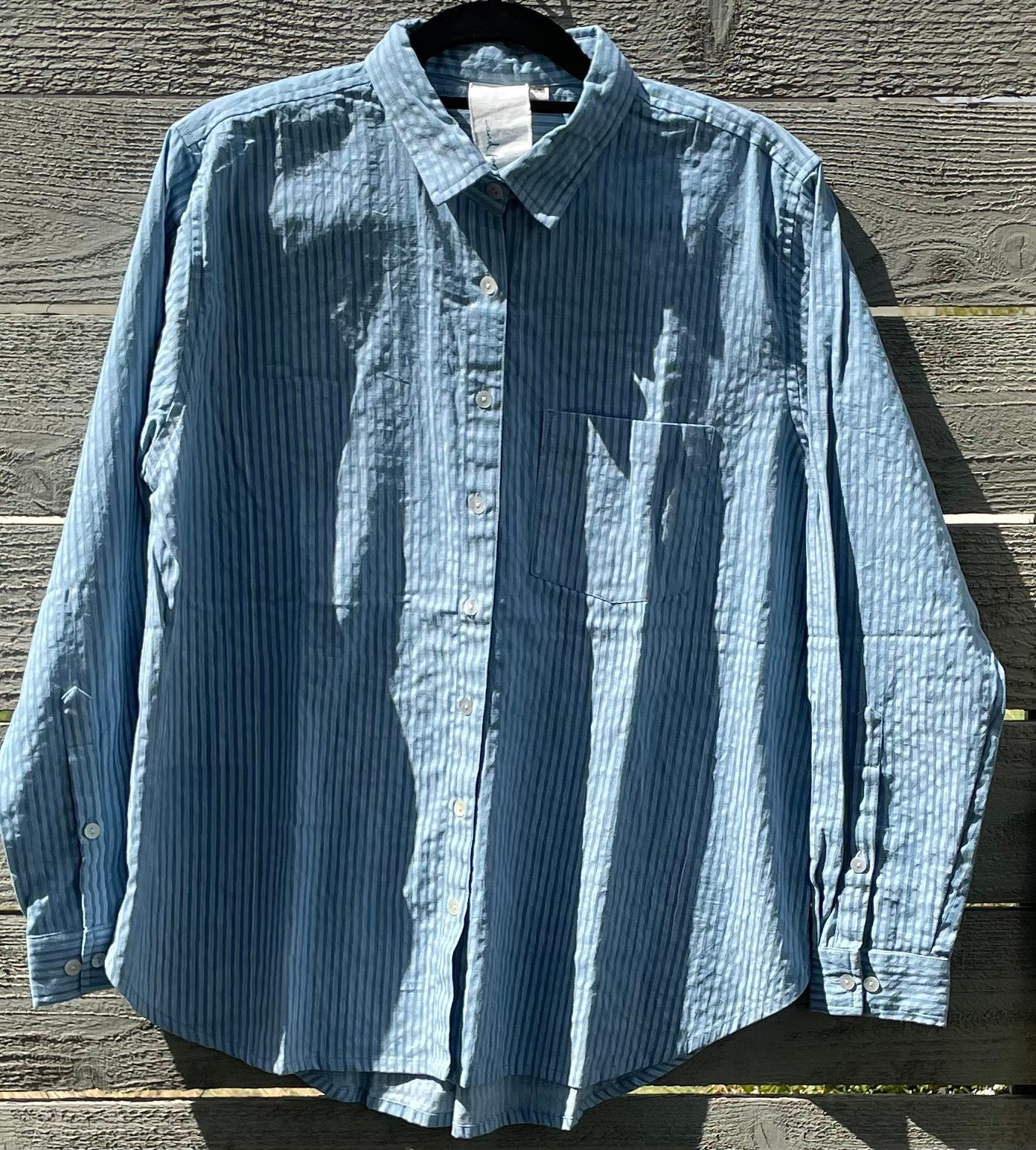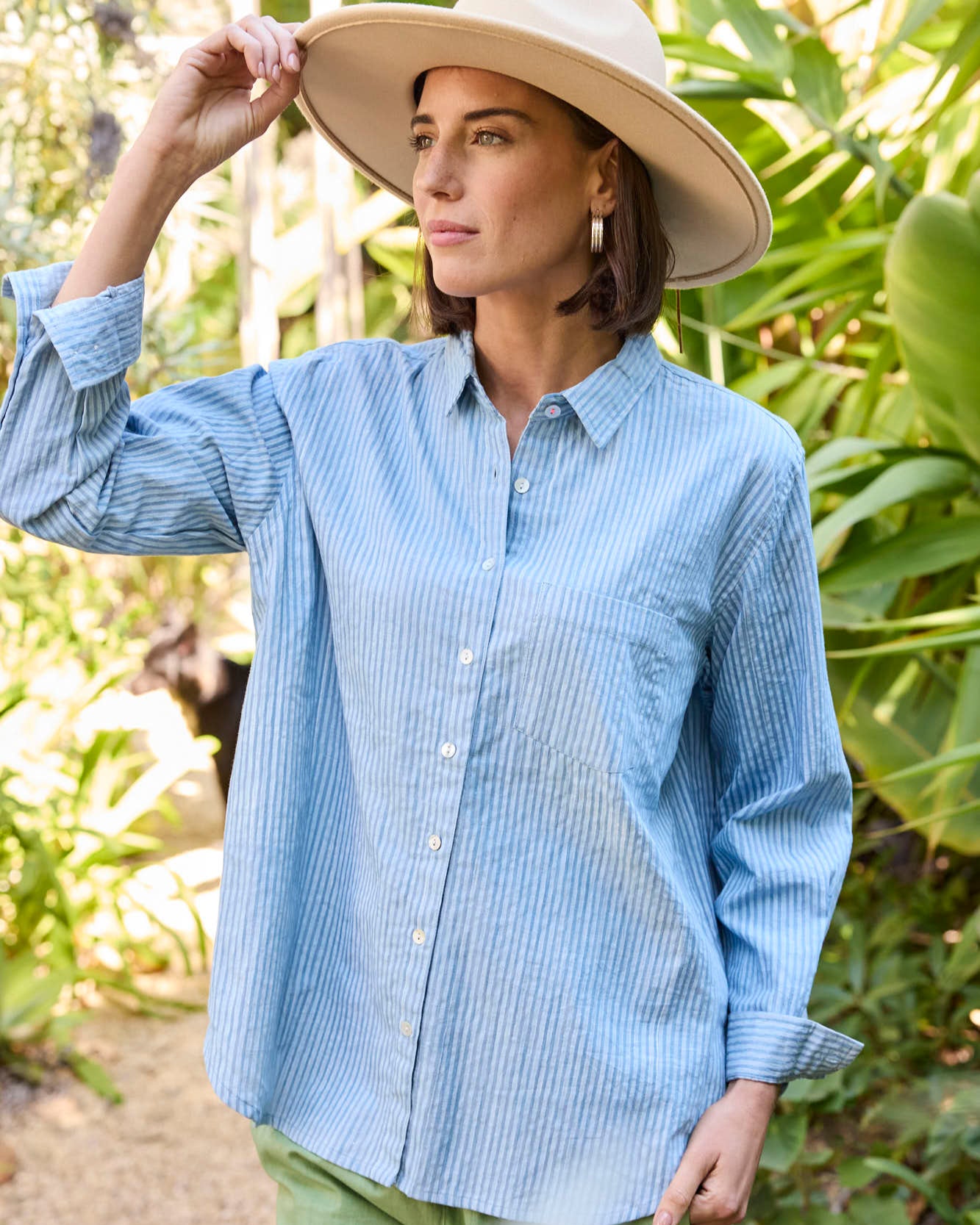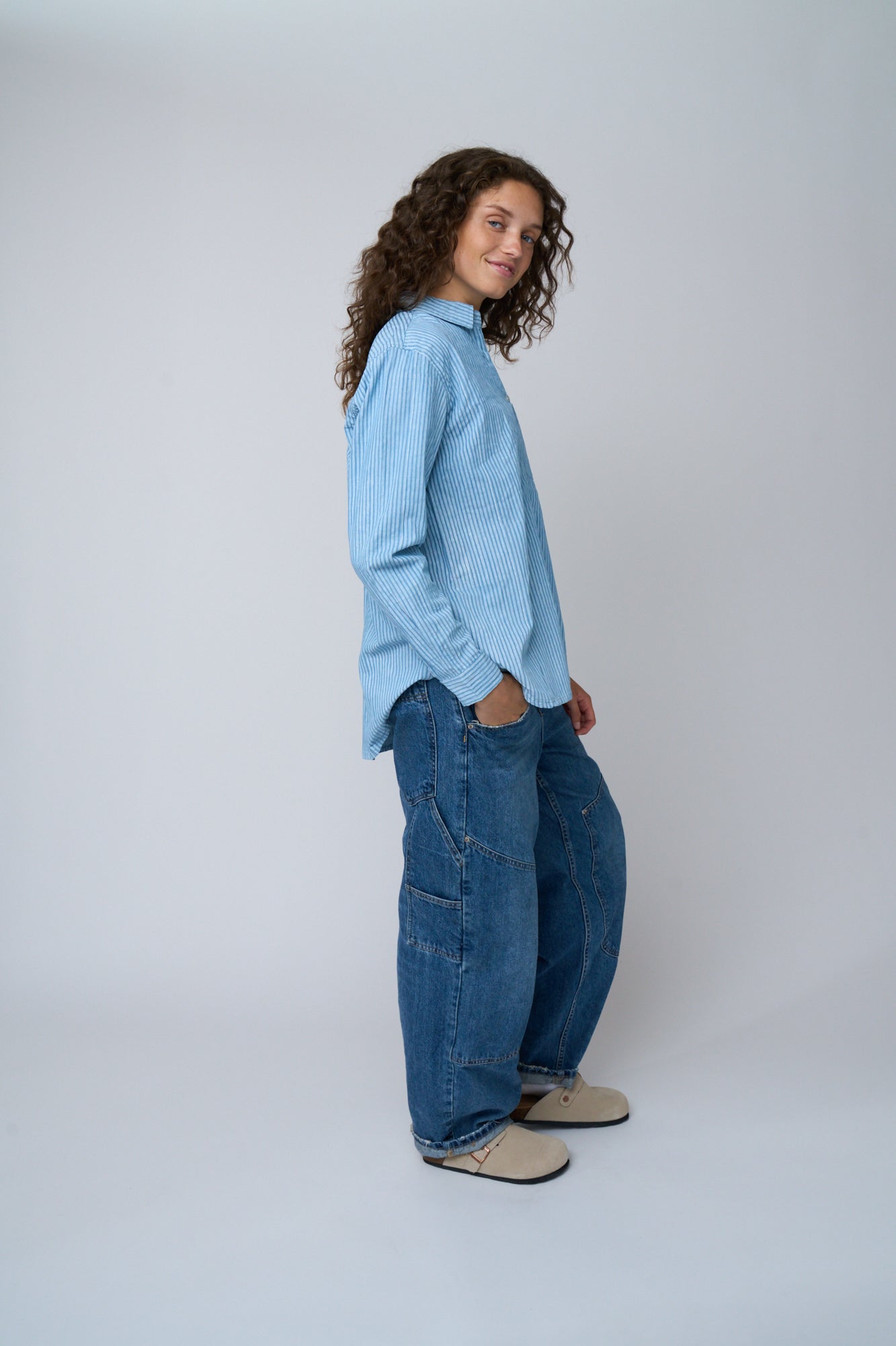The good boyfriend long sleeve button down shirt is a comfortable and effortlessly cool wardrobe staple with a sustainable story. From its origin of GOTS certified organic cotton in natural fields, to the hand loom processing, artisan crafted block from carved wood to hand stamp the stripe print, hand construction and sewing of garment; the entire lifecycle of production is sustainable and keeps the heritage of artisan practices alive. With its relaxed, modern fit, and casual silhouette, the good boyfriend shirt offers endless styling options and ways to wear this fashionable favorite.