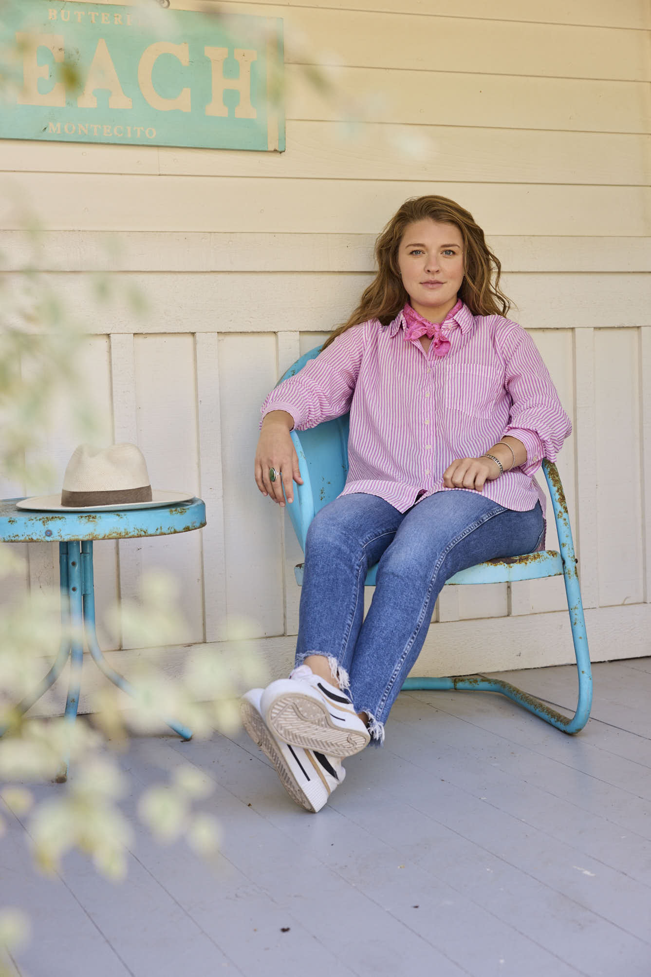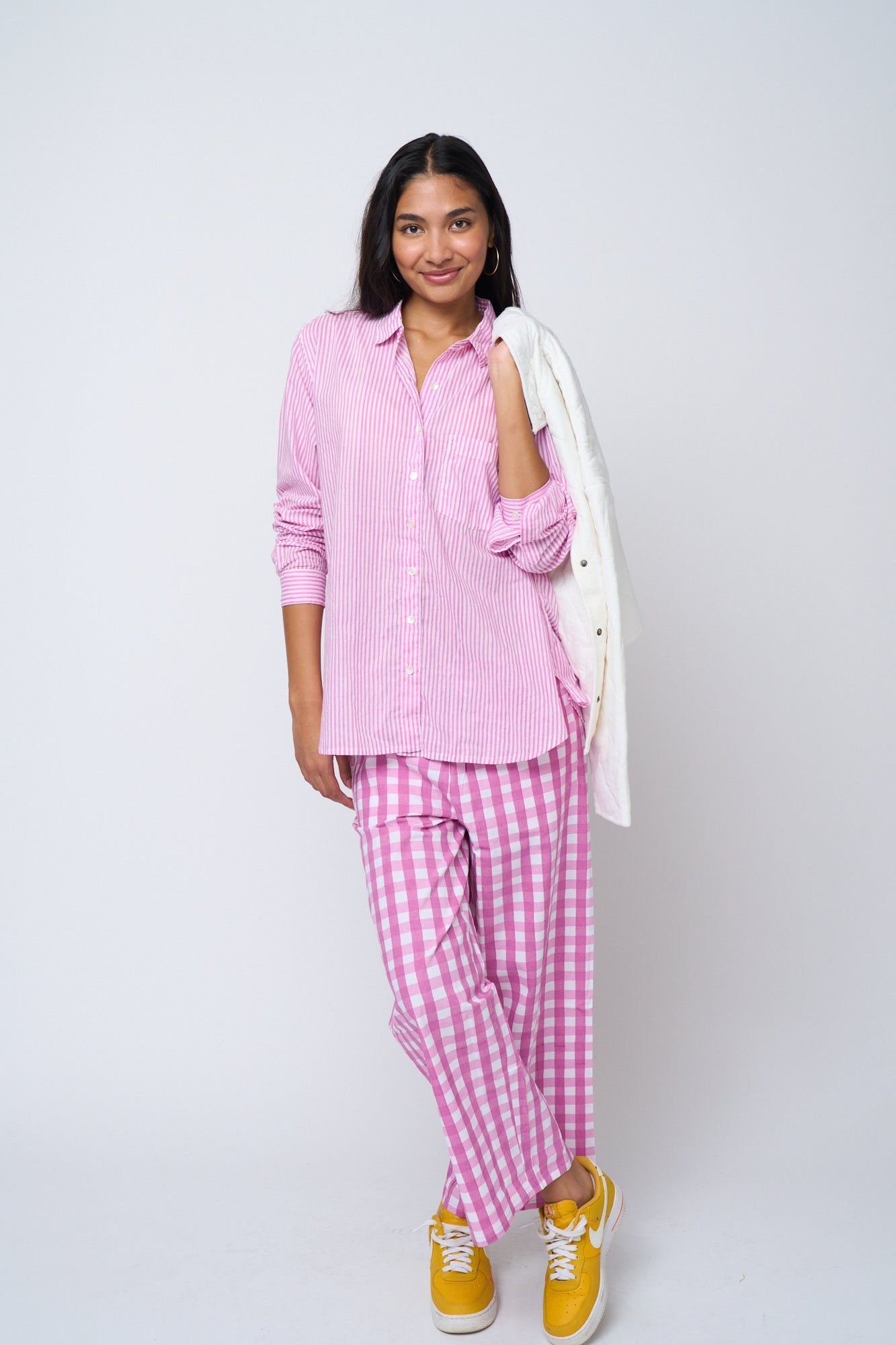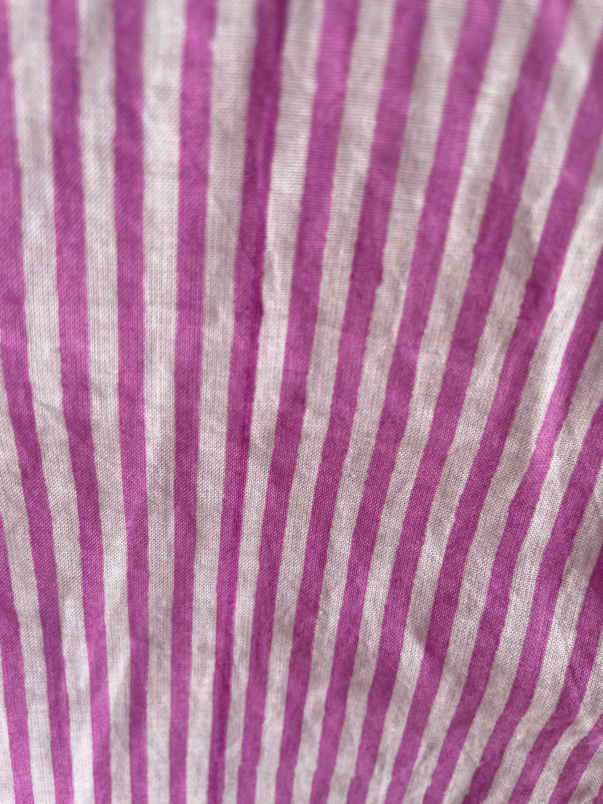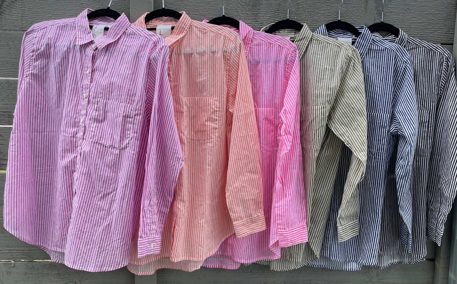 The good boyfriend long sleeve button down shirt is a comfortable and effortlessly cool wardrobe staple with a sustainable story. From its origin of GOTS certified organic cotton in natural fields, to the hand loom processing, artisan crafted block from carved wood to hand stamp the stripe print, hand construction and sewing of garment; the entire lifecycle of production is sustainable and keeps the heritage of artisan practices alive. With its relaxed, modern fit, and casual silhouette, the good boyfriend shirt offers endless styling options and ways to wear this fashionable favorite.- Organic cotton