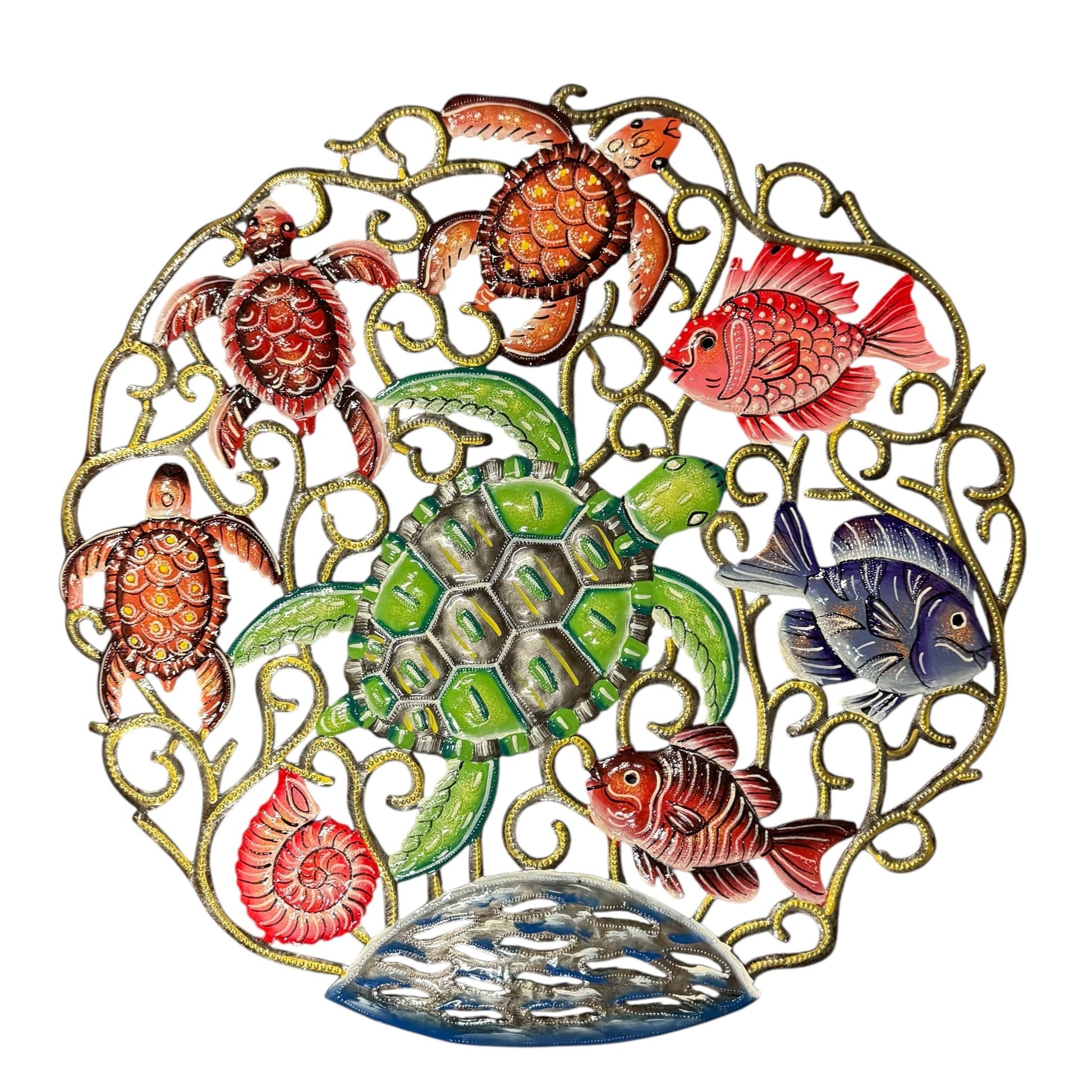 One of the most celebrated Haitian art forms, steel drum art is always a winner! Each piece is hand crafted from recycled 55 gallon drums using only a hammer and a few small tools that resemble railroad spikes. Each piece is a true work of art!