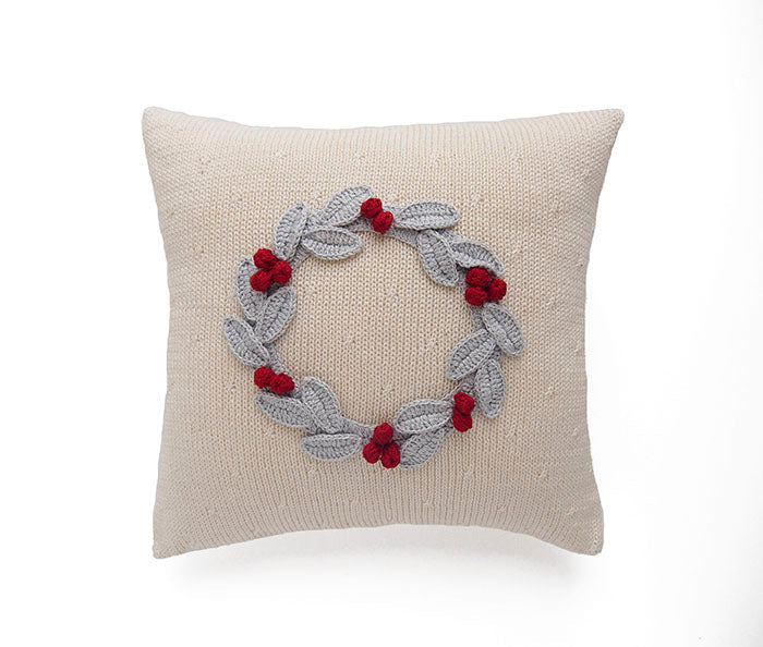 This knit holiday throw pillow brings a modern and elegant touch to your seasonal decor. Featuring a beautifully crocheted grey wreath with red berry accents on a soft cream background, this pillow offers a sophisticated and festive charm. The intricate knit details provide a textured look that blends contemporary style with cozy warmth.