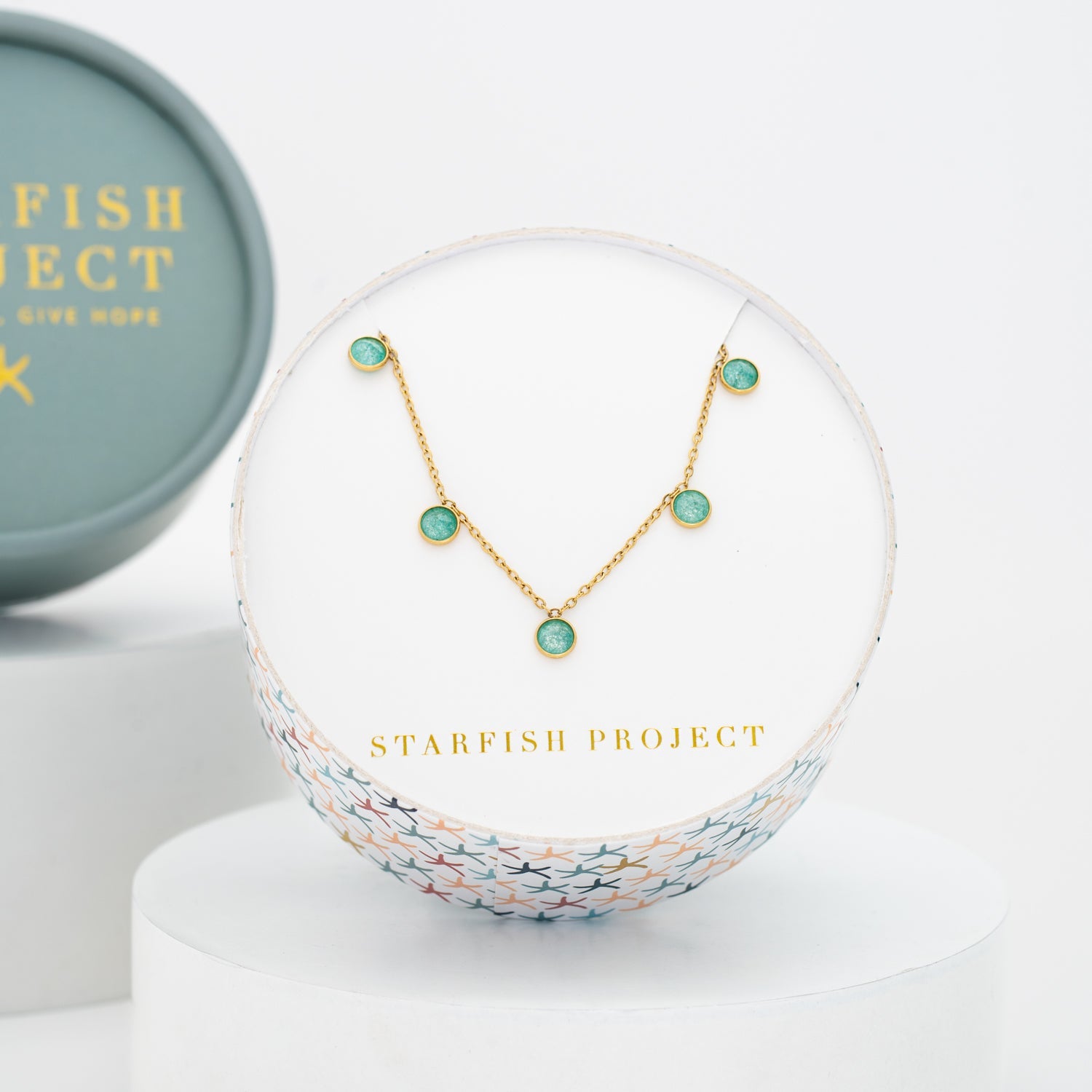 Our Guiding Lights Necklace features six shimmering zircons set along an adjustable 14K gold-plated chain — a timeless design to wear every day. Each stone sparkles like a light leading the way, a reminder that even the smallest glimmers can illuminate the path forward. With each purchase, you join a story of freedom, hope, and brighter futures for survivors at Starfish Project. Layer it with your favorite pieces or wear it solo as a delicate symbol of guidance and hope.