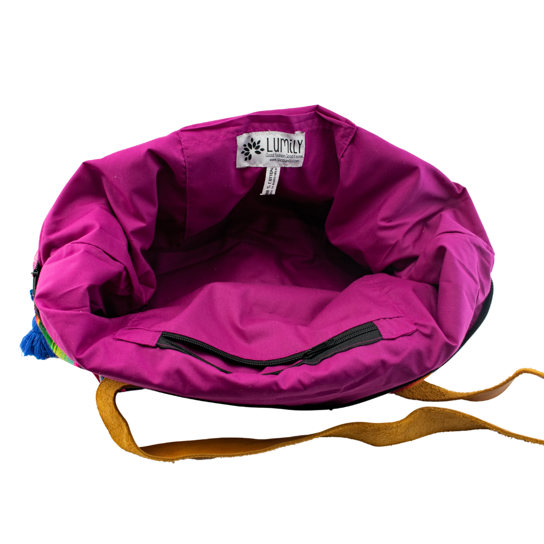 Ideal for various occasions, whether at the office or for a quick overnight getaway, this tote is both eye-catching and practical. Its interior is fully lined and features two inside pockets, one of which is a convenient zip pocket. The top is secured with a reliable zip closure, and the tote boasts wide leather straps for comfortable carrying. Elevate your everyday with this Fair Trade masterpiece that combines tradition, style, and ethical craftsmanship.