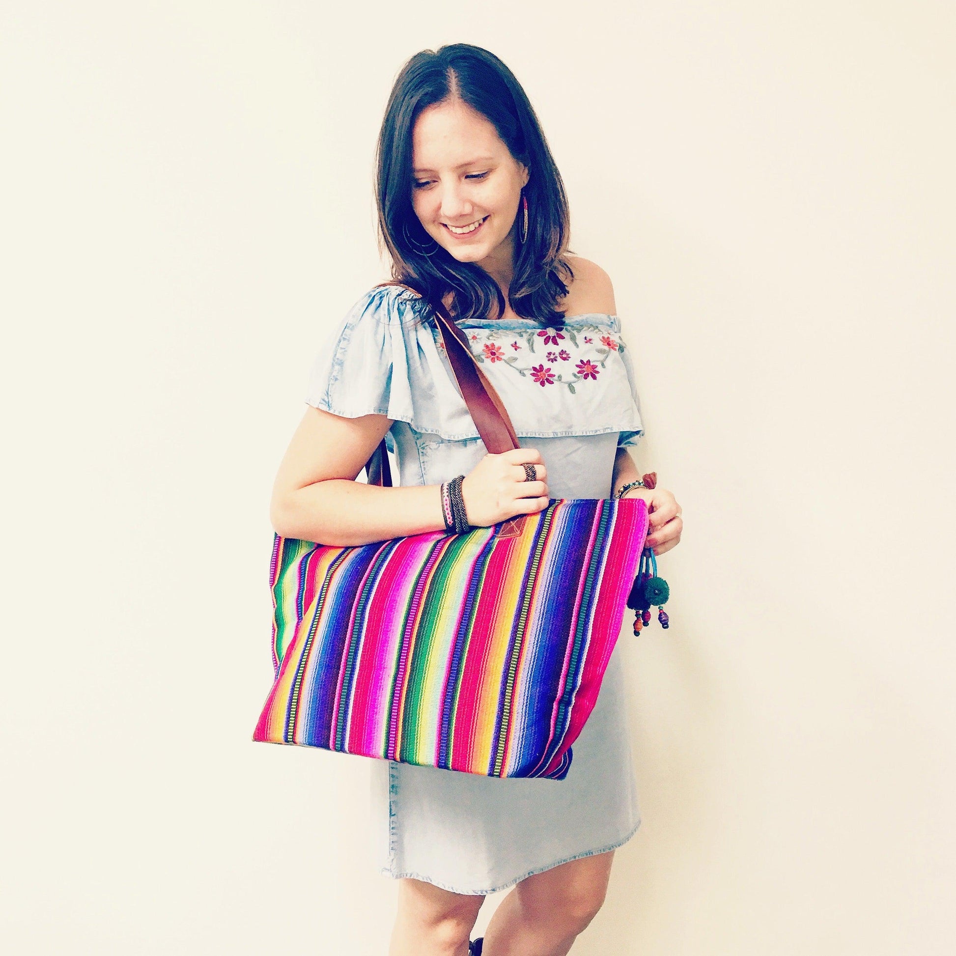Embrace style and functionality with our Hacienda Tote Bag, a vibrant creation handmade by Laura in the Highlands of Guatemala. This tote, woven from our iconic brightly striped cotton fabric is made on a traditional foot loom. This piece is a personal favorite of our founders.
