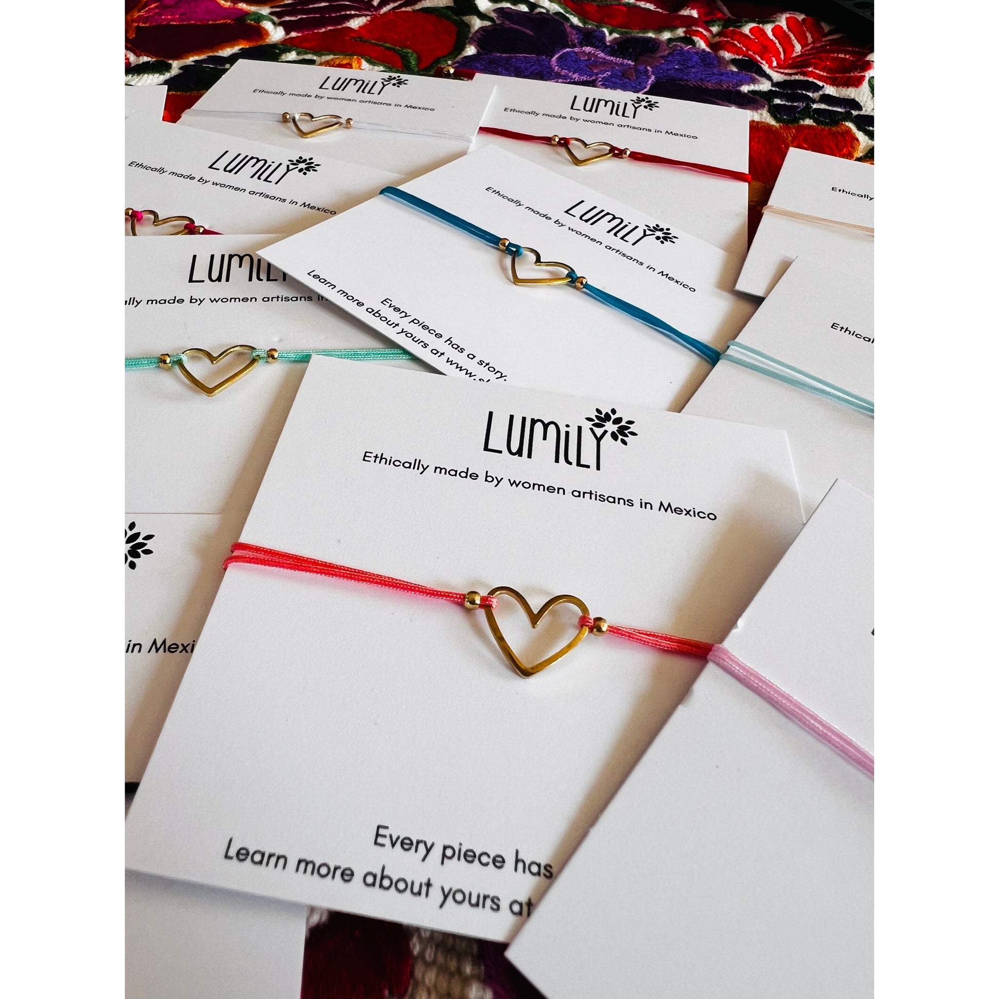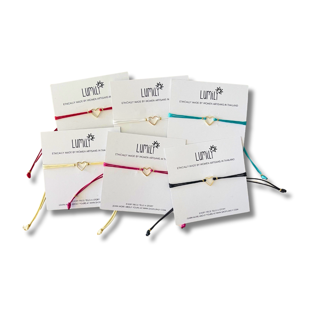 Available colors: Aqua, White, Black, Pink, Cream and Red Handmade in Thailand Heart is .4" wide - Adjustable closure Limited edition design Dainty and minimalist style, perfect for everyday wear