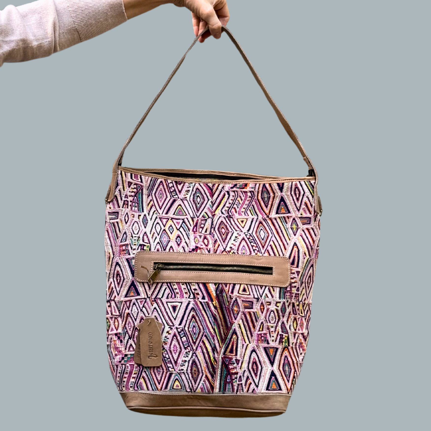 Intertwined's huipil bucket bag is sustainably made from a second-hand huipil, a traditional handwoven blouse worn by Mayan women in Guatemala. Cuero Malec, a Guatemalan leather shop, recycles these huipiles by transforming them into gorgeous, durable, handcrafted artisanal bags. A one-of-a-kind blend of traditional style and modern sustainability! It's an eco-friendly fashion statement for all occasions.