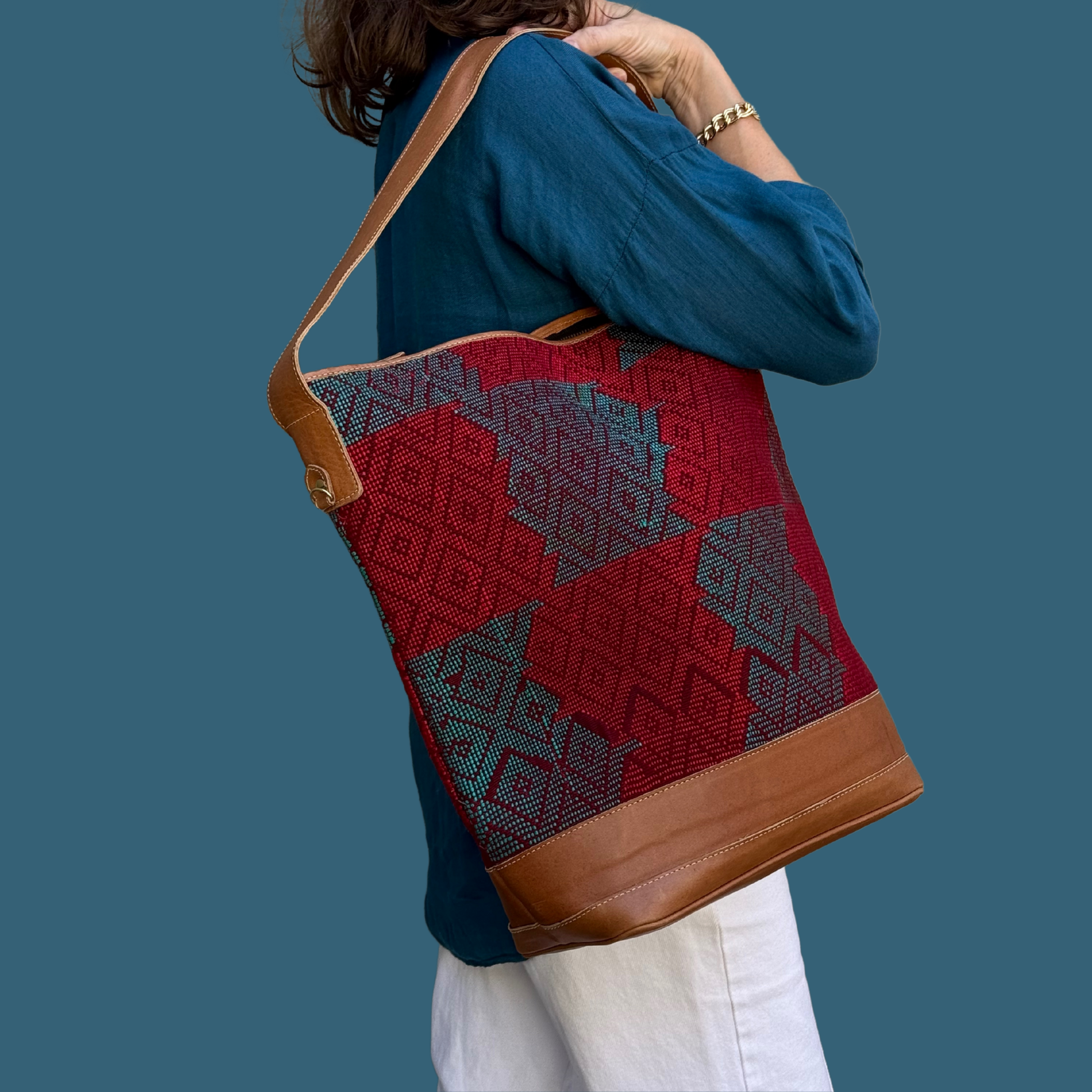 Intertwined's huipil bucket bag is sustainably made from a second-hand huipil, a traditional handwoven blouse worn by Mayan women in Guatemala. Cuero Malec, a Guatemalan leather shop, recycles these huipiles by transforming them into gorgeous, durable, handcrafted artisanal bags. A one-of-a-kind blend of traditional style and modern sustainability! It's an eco-friendly fashion statement for all occasions.