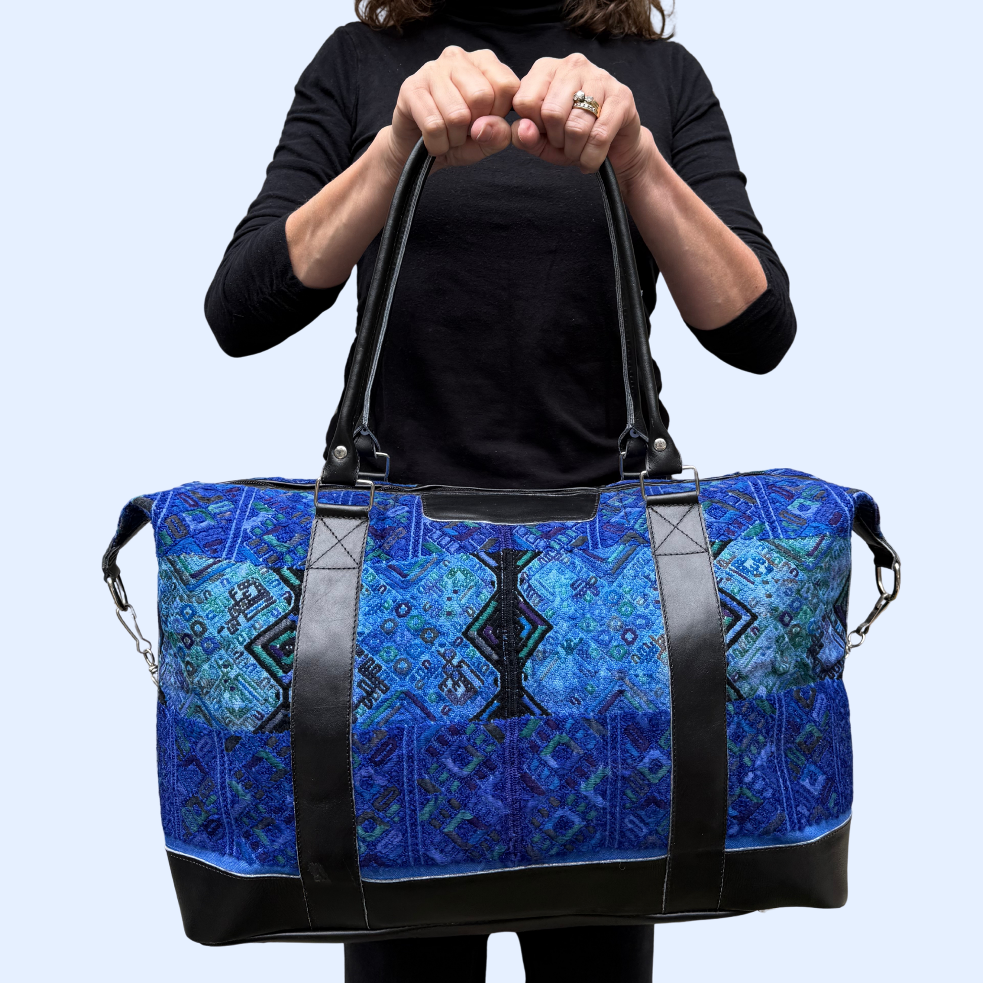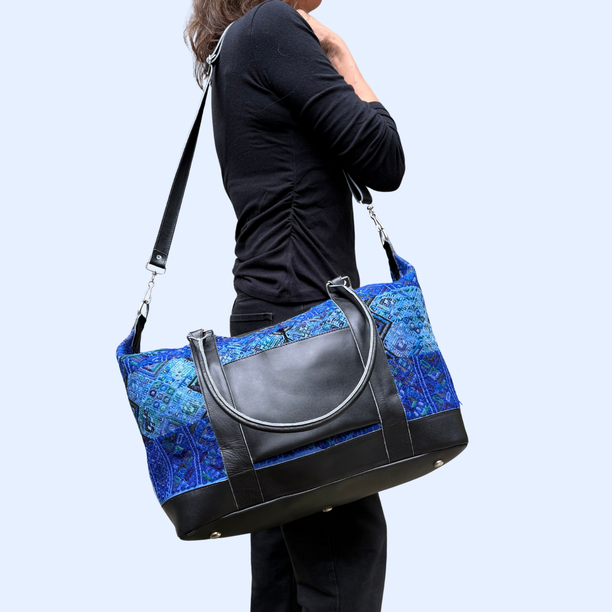 When Intertwined's Huipil Weekender is a smidge too large, choose our Huipil Mini-Weekender. It carries all your essentials and fits under the seat on a plane, attaching to your roller bag with its trolley sleeve. Stunning handwoven vintage huipils are turned into beautiful bags by skilled leather artisans in Guatemala. (Just in case you were wondering, a huipil is a Mayan blouse!)