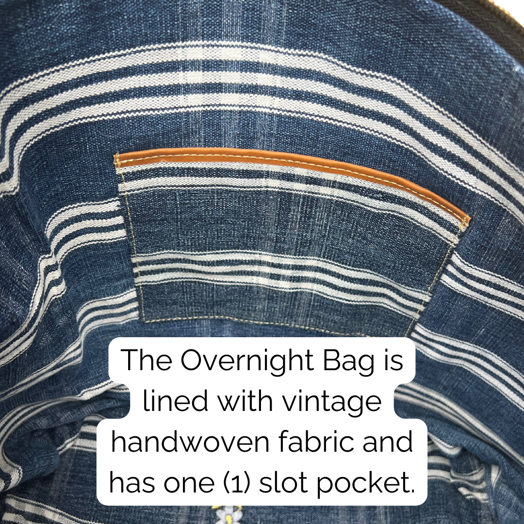 Vintage cotton exterior with slip pocket trolley sleeve. Fully lined with vintage cotton fabric. One interior slot pocket and one zippered pocket. Sustainably sourced, vegetable tanned leather.
